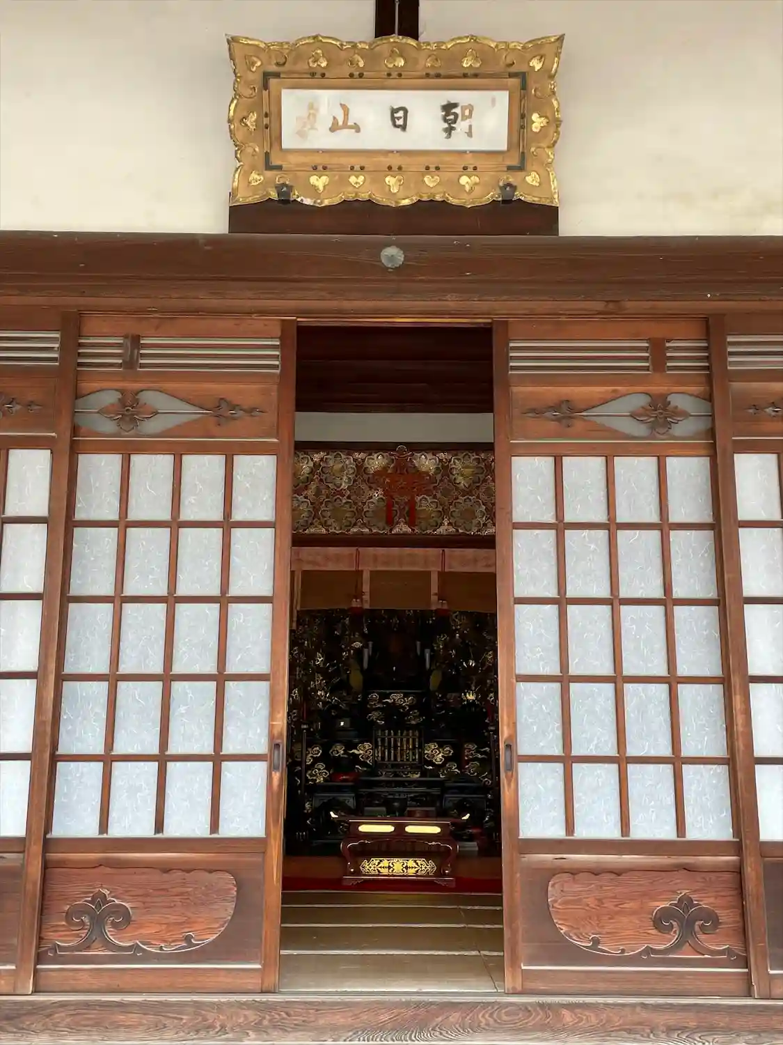 本堂正面にのぞく<救世船乗観音>。