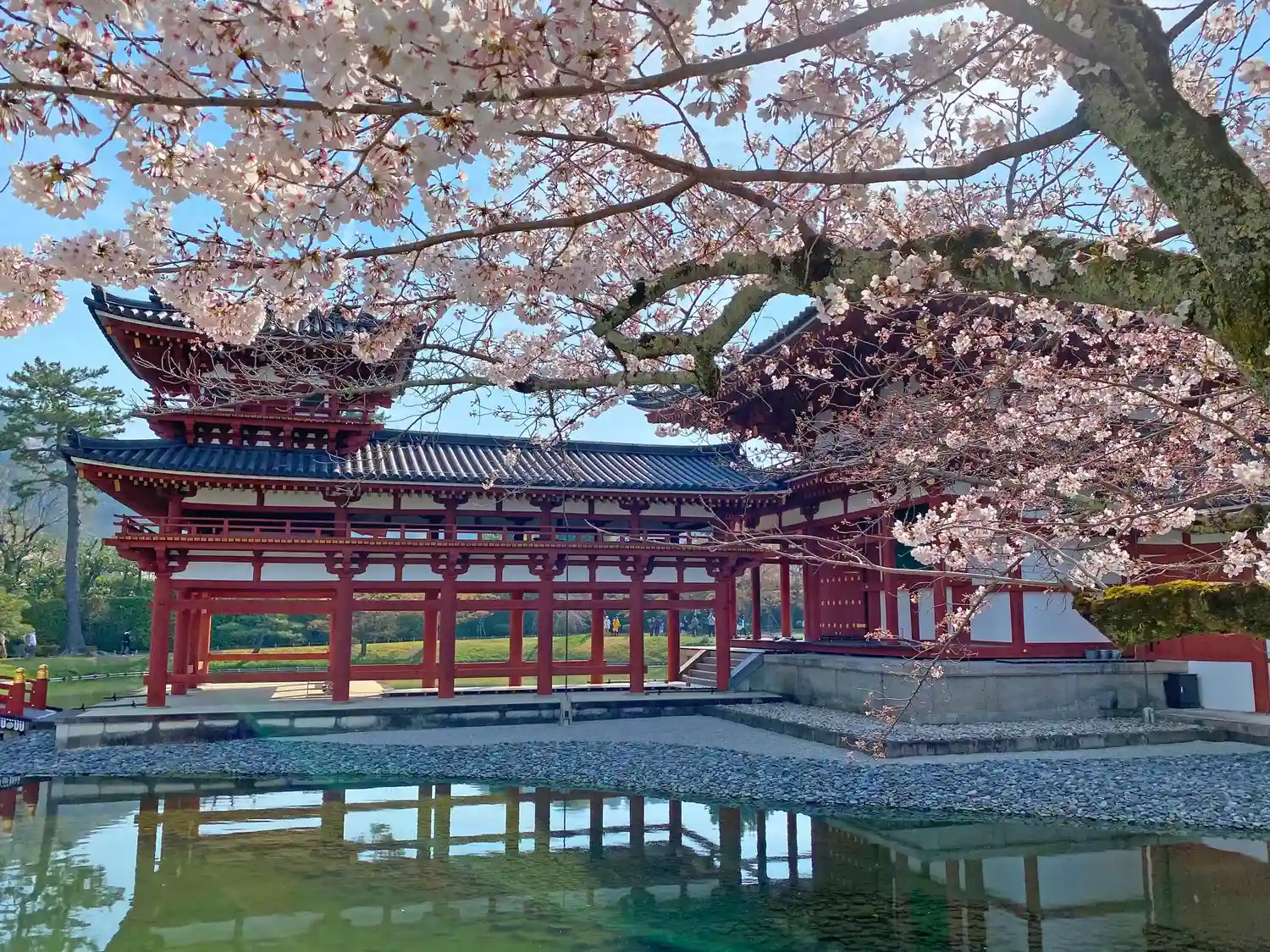 最勝院の入口付近から見た鳳凰堂。手前の桜が満開。