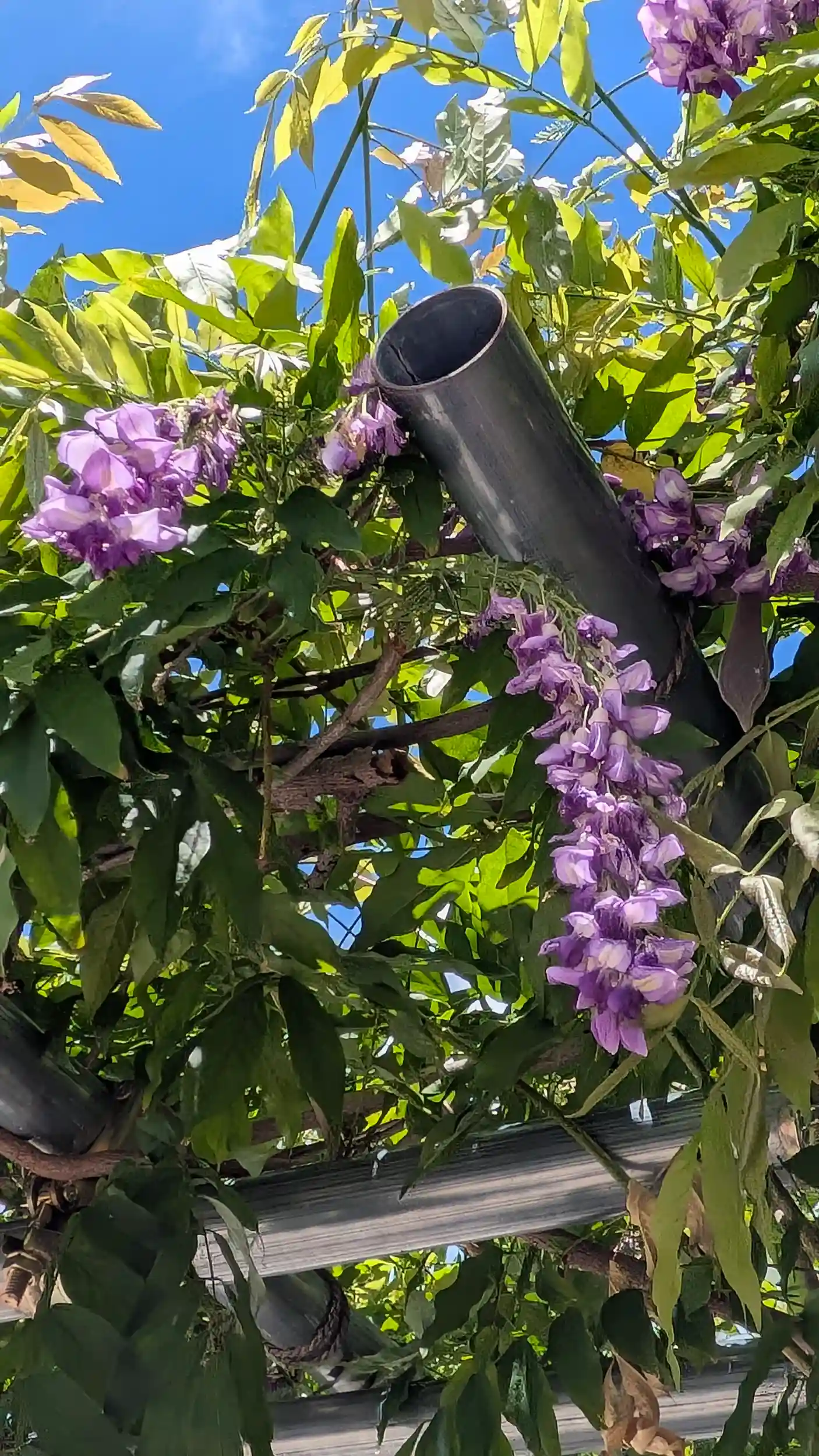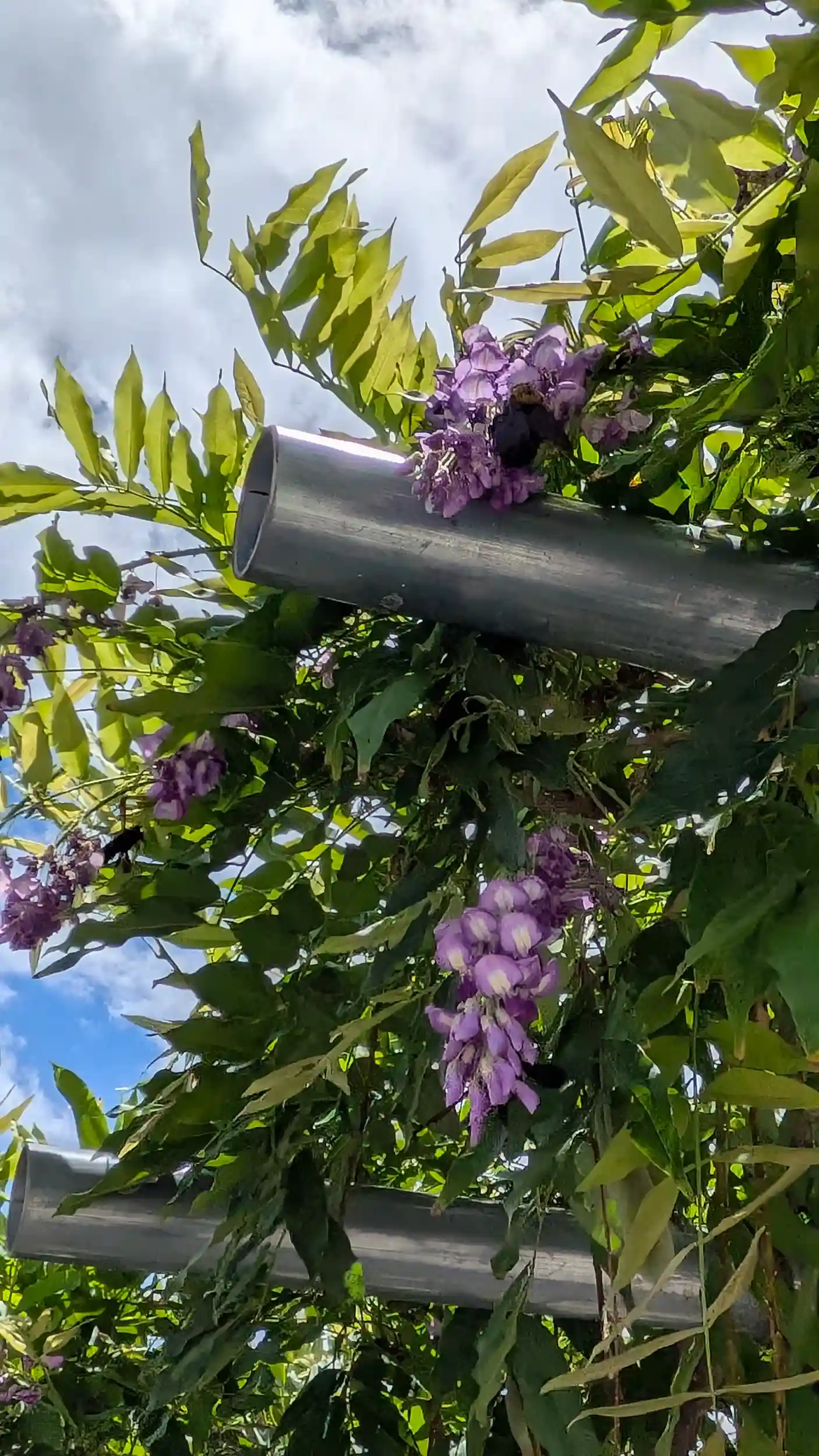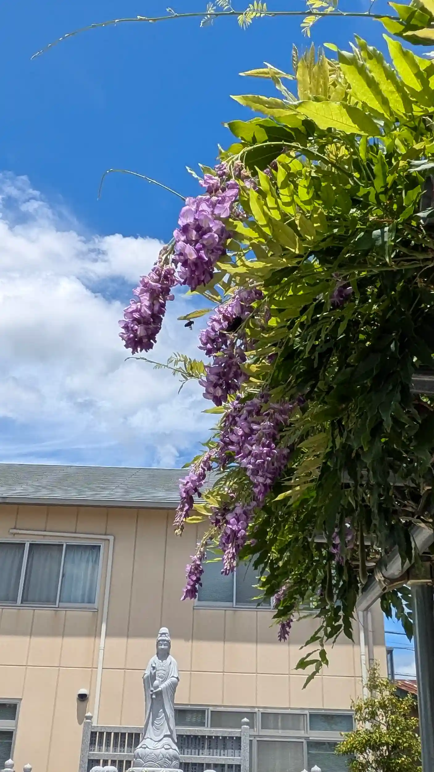 月参り。牛さんにお詣りして境内へ・・・ん?藤棚に花っぽいものが…と思い近づいてみると藤の花が咲いてました(やや萎れかけでしたが)😲ここ数日の雨模様で梅雨と間違えたのかな?