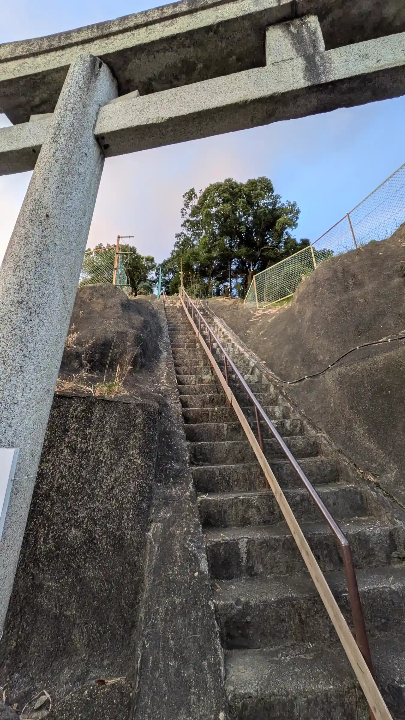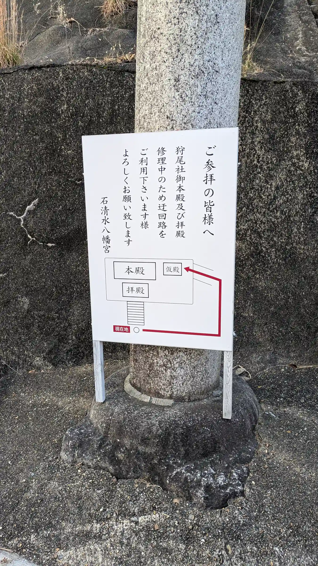 GoogleMapでお見かけした狩尾神社へ。本殿拝殿修理中とのことで迂回路の案内がありました。案内…