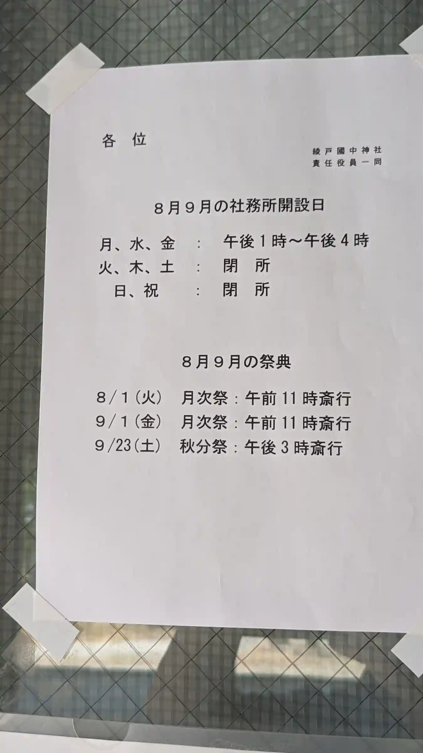 社務所に貼ってあったお知らせ