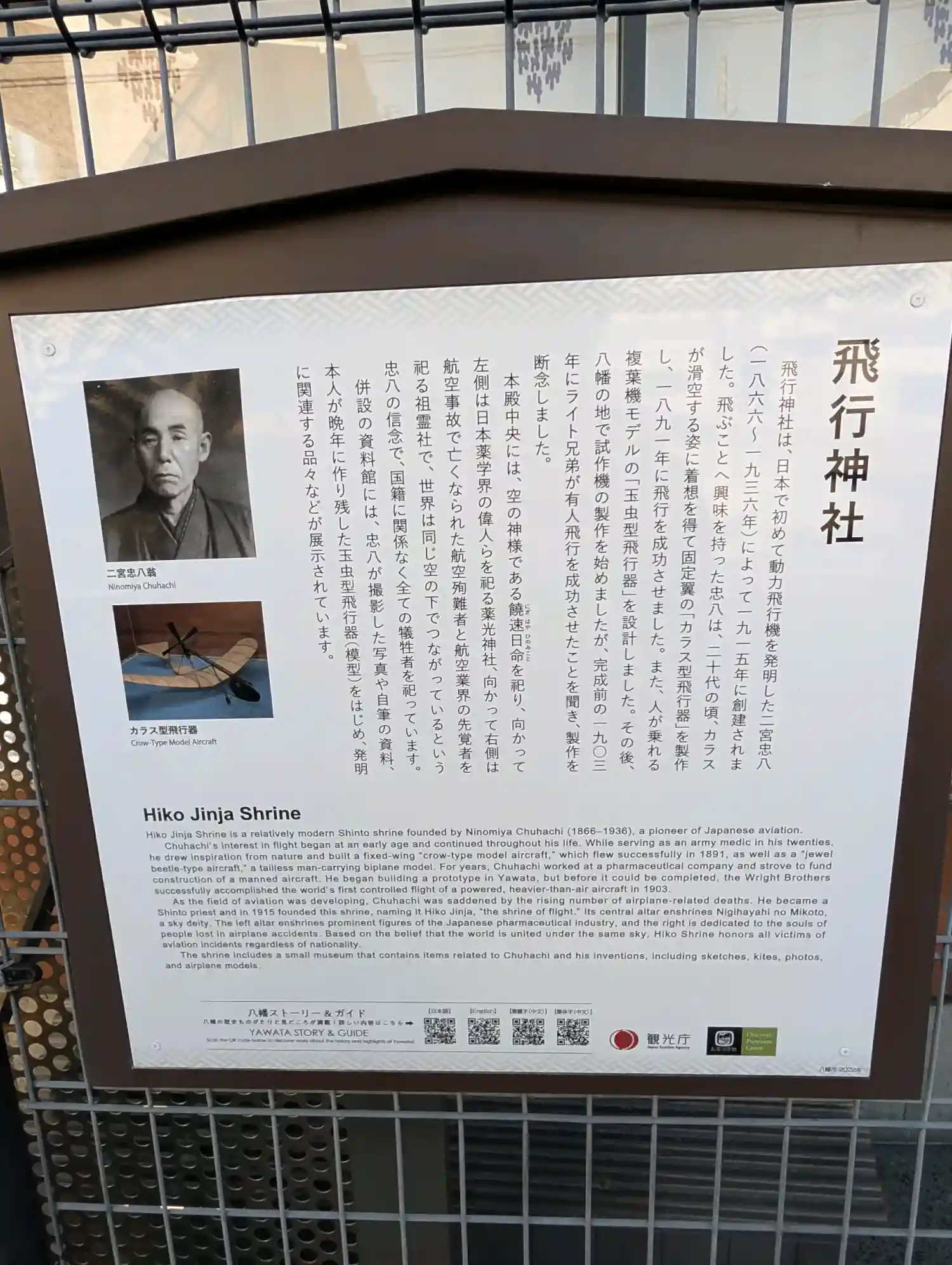 飛行神社を創建したのは、明治24年4月29日香川県丸亀の歩兵第12聯隊練兵場に於いて、日本人として最初のゴム動力によるカラス型飛行器の飛行に成功した愛媛県ハ幡浜出身の二宮忠八です