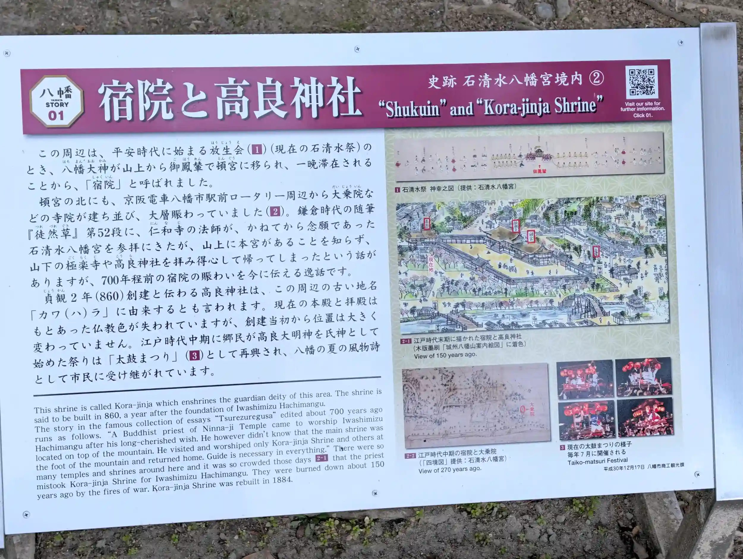 吉田兼好が著した日本三大随筆集に数えられる「徒然草」第52段に有名な逸話がある。それは、仁和寺の法師が山麓の高良神社を本宮・石清水八幡宮と勘違いし、山上まで上がらずに帰ったという話に記されている。地域の人々が心のよりどころにした氏神であったと言われている。
