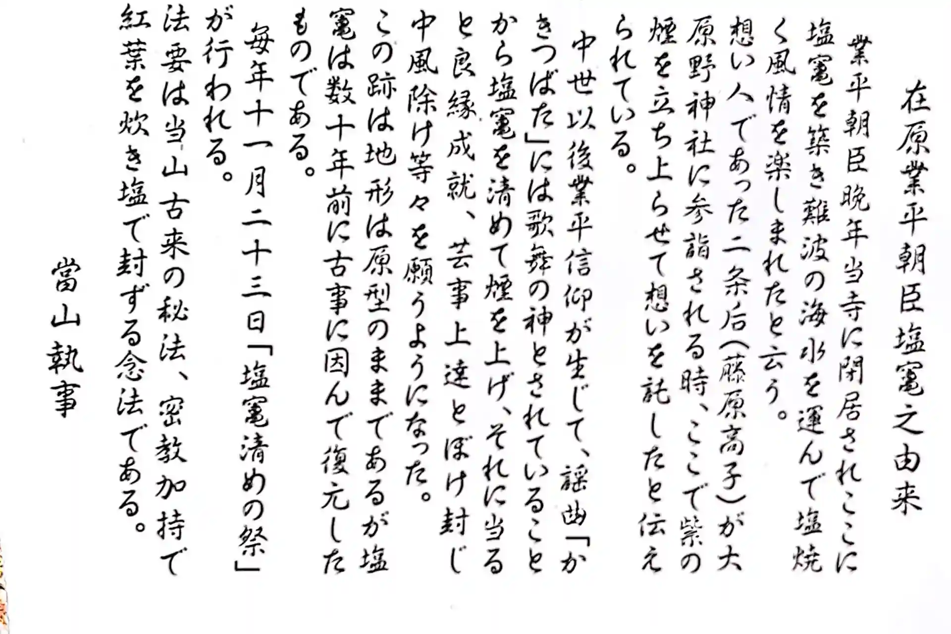 平安時代の貴族には、「塩焼」と呼ばれる塩を焼いてその煙を楽しむ風習がありました。本堂の裏手にある塩竈の跡は業平が塩竈を設け、紫色の煙を上げていたといういい伝えが残されています。