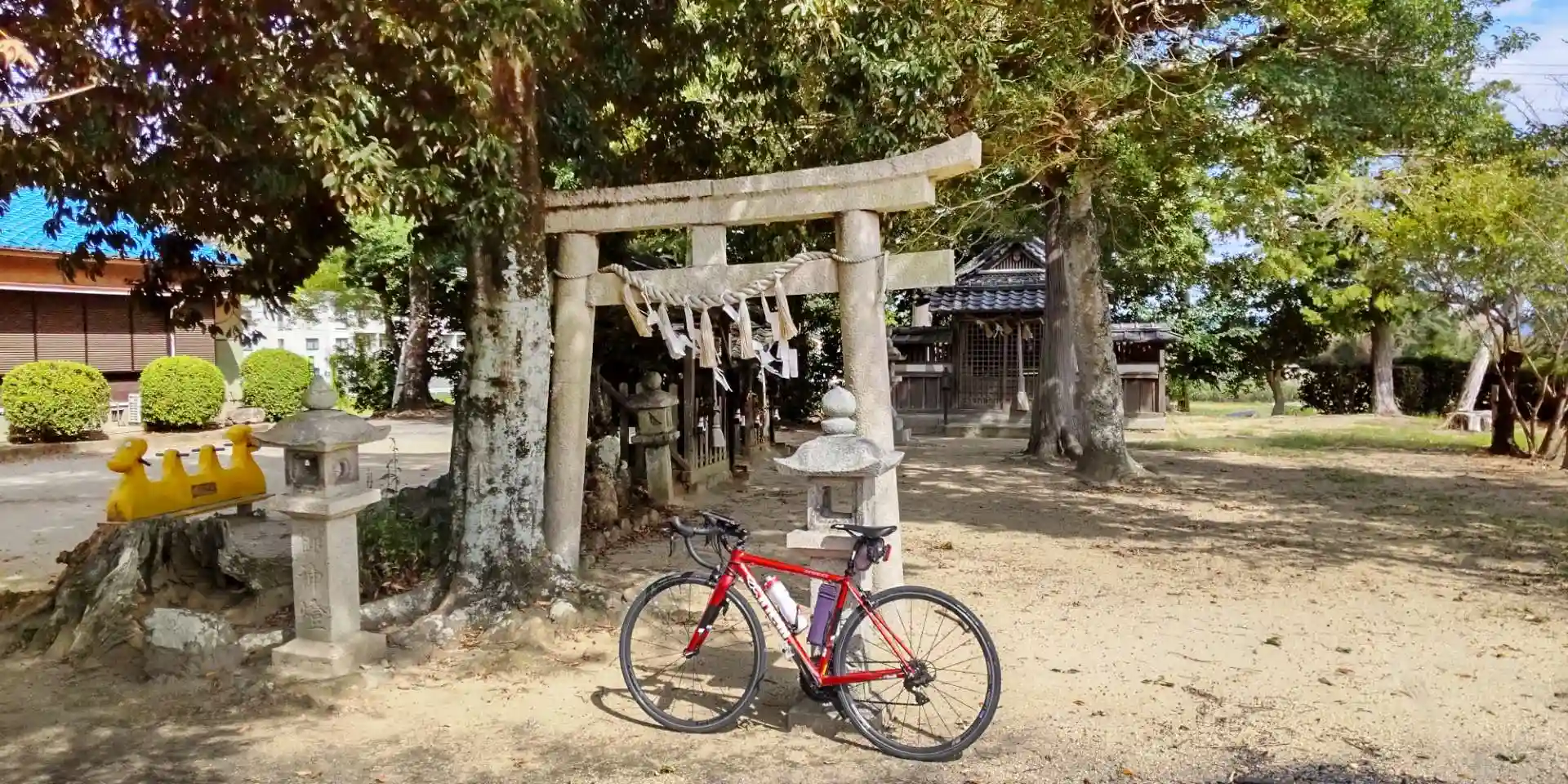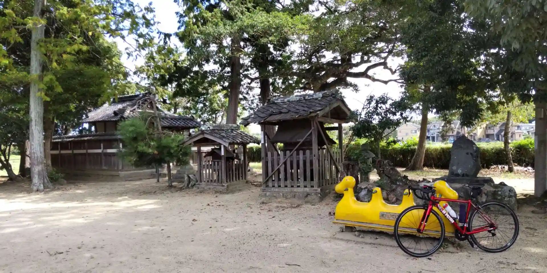 細い林道みたいなところに入り込んだところでこちらの神社に巡り会えました。こちらもさよなら夏の日です!黄色い3人乗りの遊具、かなりレアキャラです!