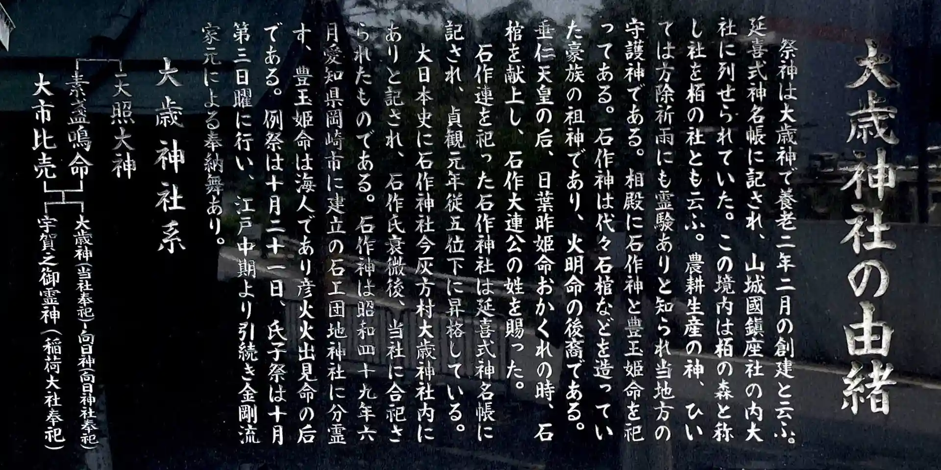 祭神は、大歳神です。農耕生産の神、方除祈雨の神、当地方の守護神ということです。相殿に豊玉姫命、石作神を祀っています。