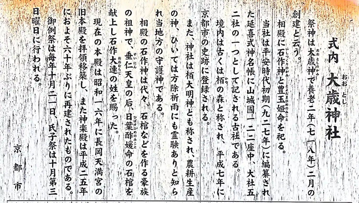 | ご由緒 | 祭神は大歳神で養老二年(718)二月の創建と云う。