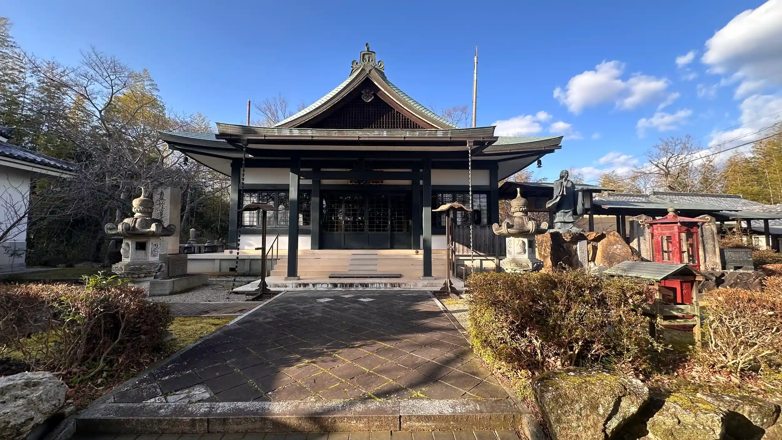 本化上行宗と言う日蓮宗に関わる宗派のようです、同志社大学の京田辺キャンパスの中にポツンとあります。境内は新しくて古いお寺の雰囲気はあまりありません。日蓮上人と思われる銅像もあります