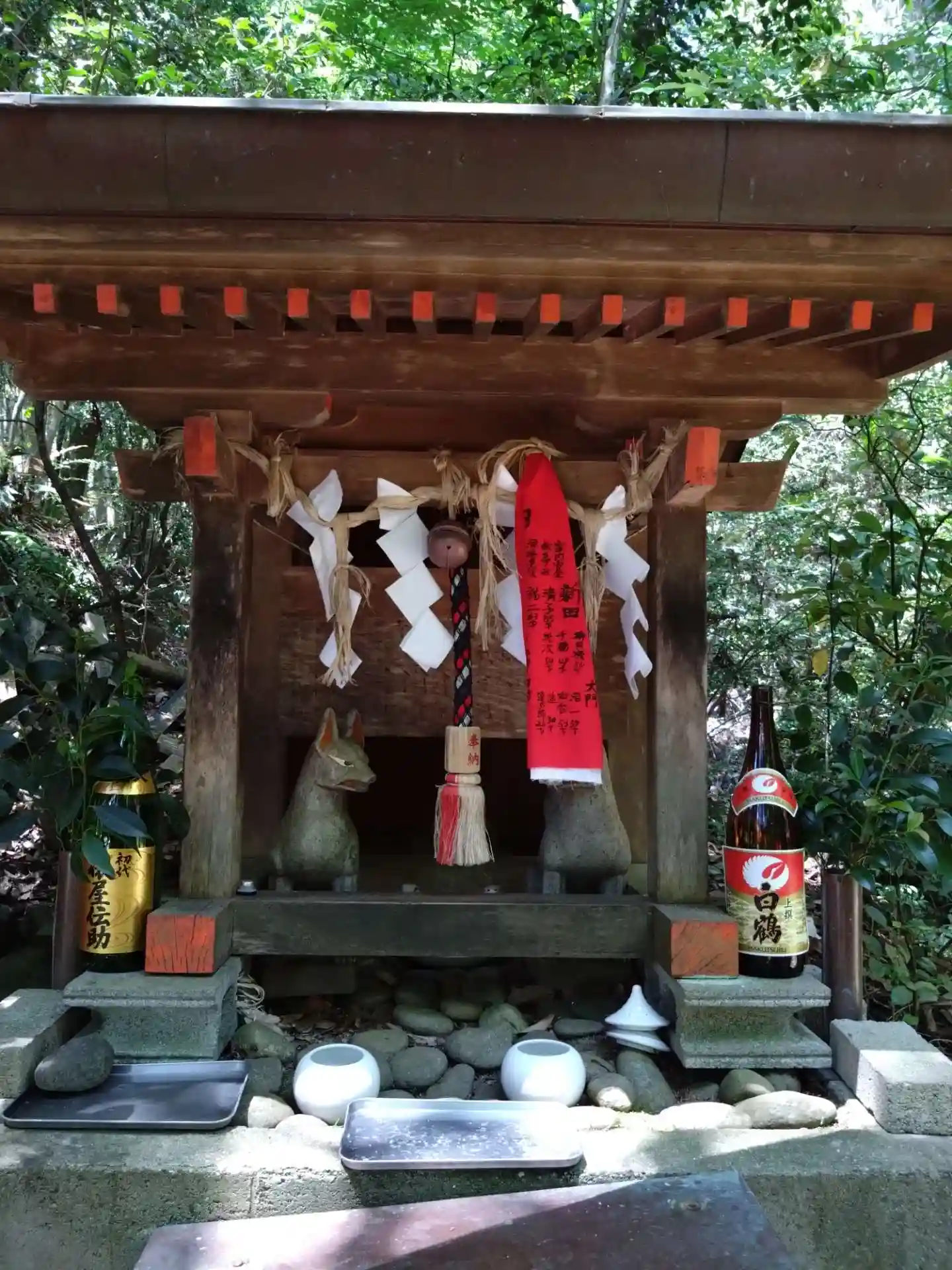 細い道の先に道から見える赤い鳥居が綺麗です。ここを守っている人がいるのですね。