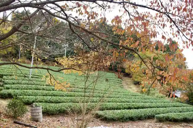 駐車スペースあり。参道横は見事な茶畑。