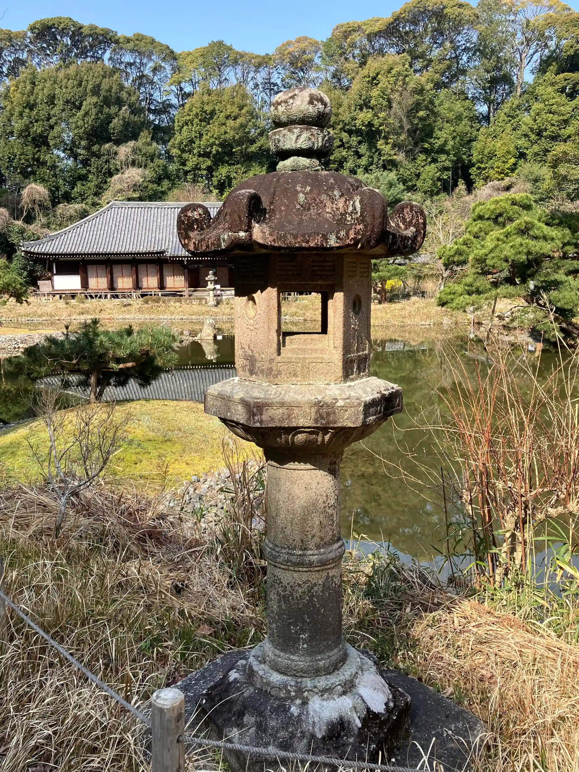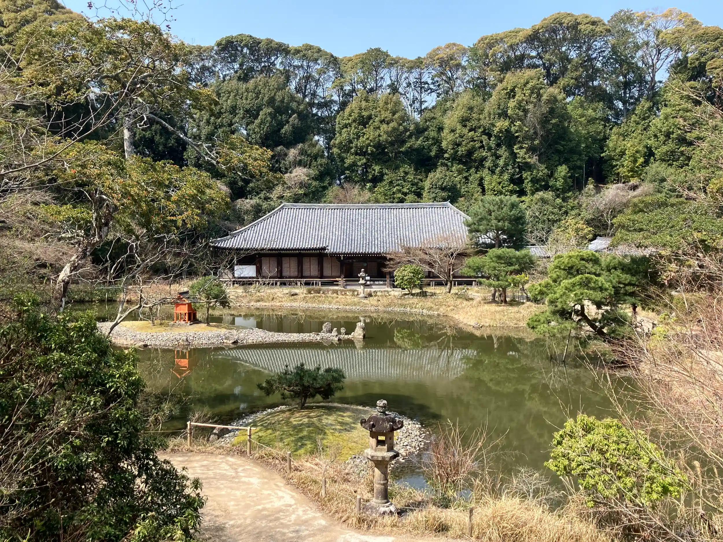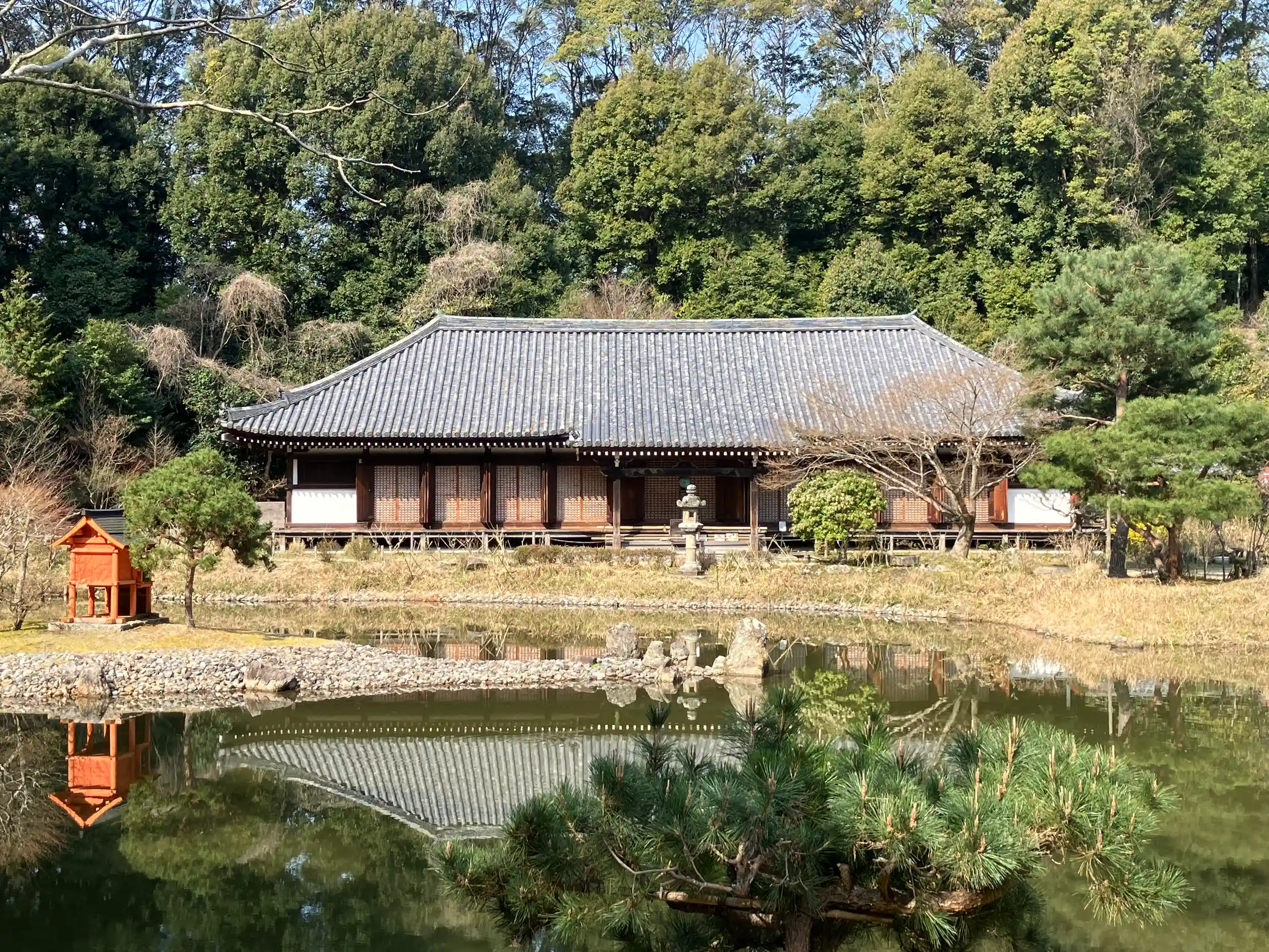本堂は九体阿弥陀如来像を納める厨子の役割を果たしており、本堂側を彼岸(浄土)苑池を挟んで対岸を此岸(現世)に見立て、三重塔側から参拝する造りになっている。