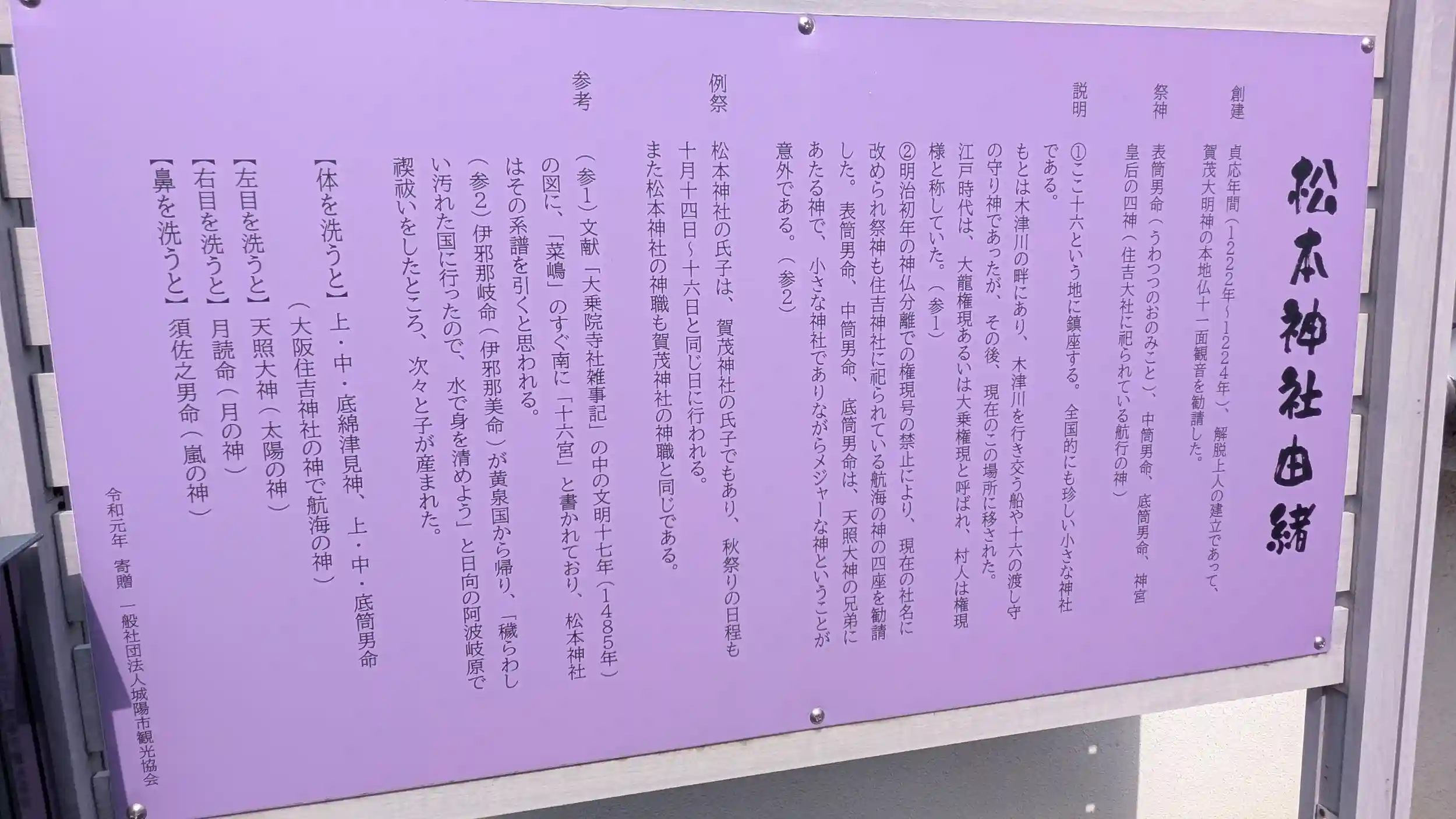 十六庚申堂から奈良街道を北へ100mぐらいでお見掛けした松本神社。小さな神社でしたが由緒書きもあり、住𠮷大社の御祭神を祀っておりました。翌日15日と16日が例祭のようで提灯が建てられておりました😊絵馬も飾られておりなかなか地元に大切にされている神社なんだろうなぁと思って調べたら、その社号から「関西嵐神社」の一つとのこと😲松潤こと松本潤の苗字を冠していることから滋賀県栗東市の「大野神社」、大阪府堺市と兵庫県尼崎市の「櫻井神社」、兵庫県神戸市中央区の「二宮神社」、そして福井県あわら市の御前神社内にある「相葉神社」と合わせて嵐の聖地とされているらしい😲由緒や絵馬が紫なのも松潤カラーに合わせてなのだそう。ちなみに神社は無人のため絵馬は近鉄寺田駅前の城陽市観光協会で拝受できるそうです。とはいえ嵐も解散だから今後どうなるんでしょうねぇ・・・😅