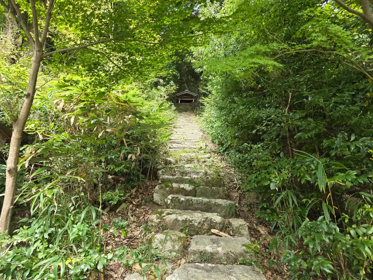 モミジの新緑が美しく、秋にもお詣りしたい。
