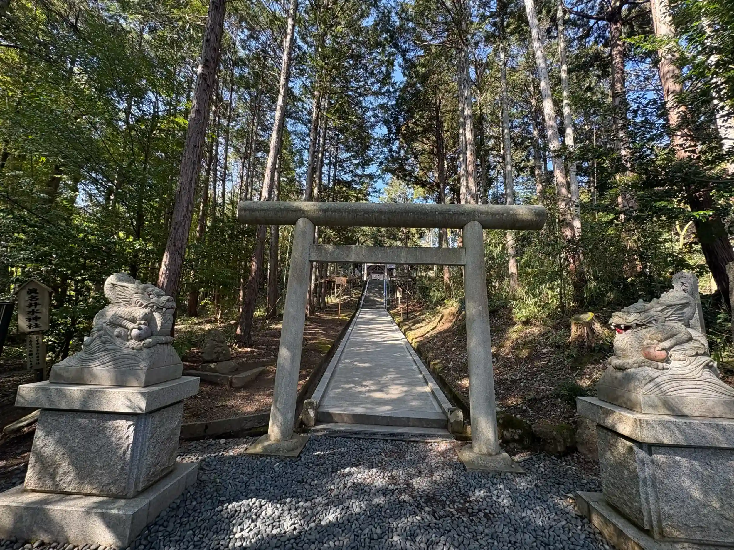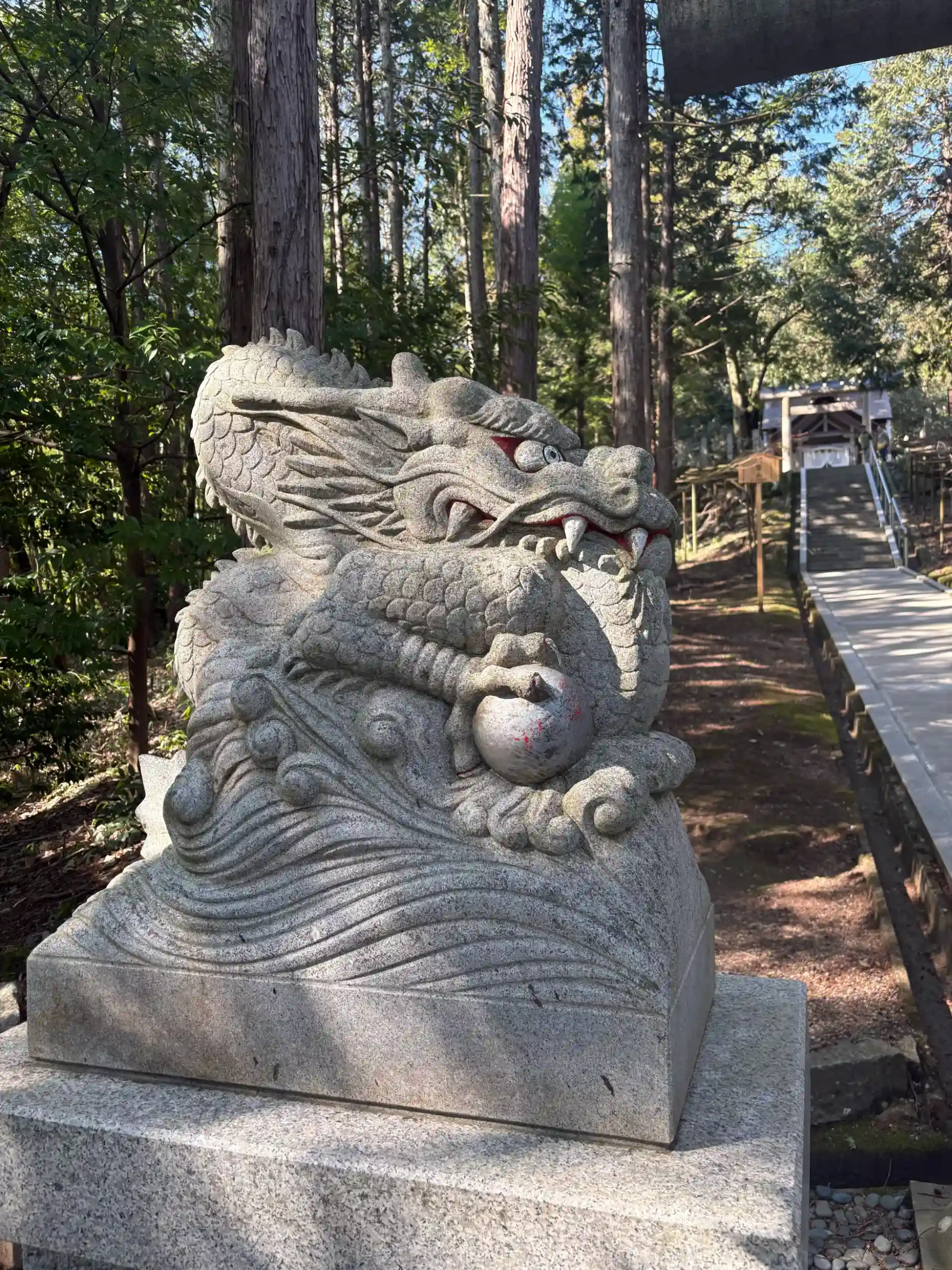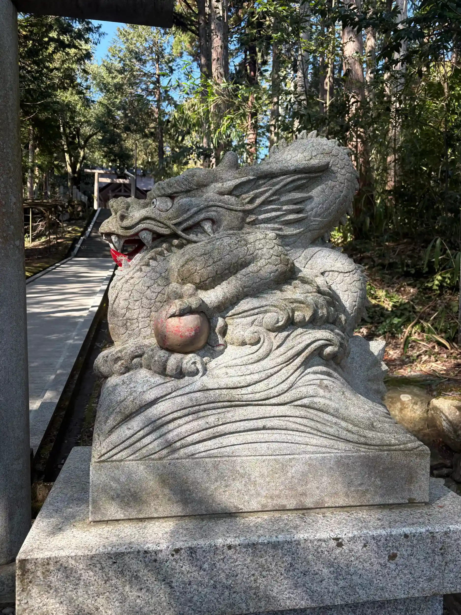 また、真名井の水を守る眷属(けんぞく)として龍が信仰されており、参道入口には、龍宮から授かったとされる2つの宝珠を持つ「狛龍(こまりゅう)」が鎮座しています。