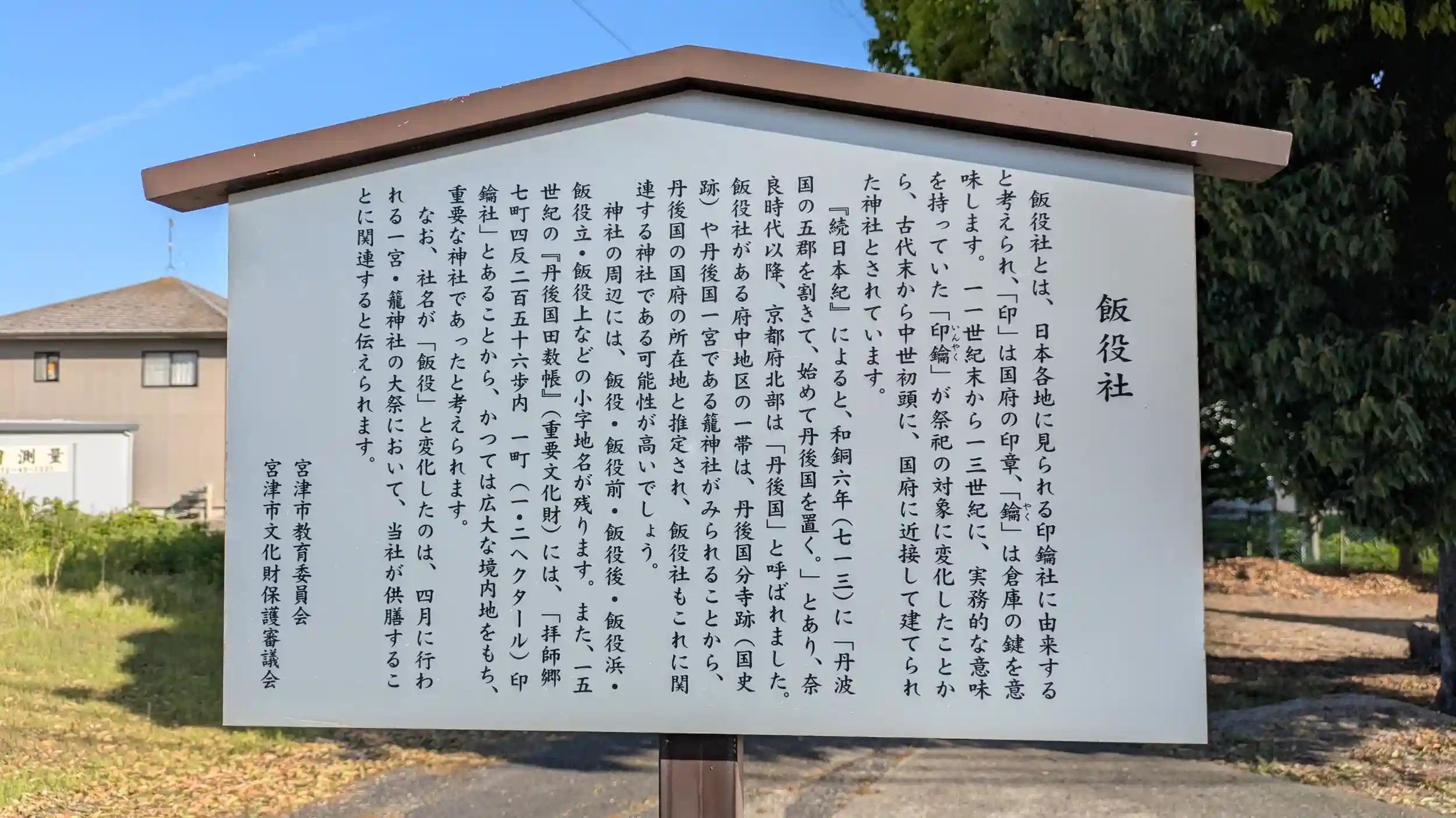 長徳寺から少し東へ行くと鳥居をお見掛けしたので寄り道。飯役社とあり、もとは「印鑰社」に由来するとのこと。国府に近接して建てられた神社であり、かつては広大な社領を持つ重要な神社だったよう。籠神社の大祭において当社が供膳することから飯役社に変化したと伝えられています。今はいたってシンプルな小さな御社です。