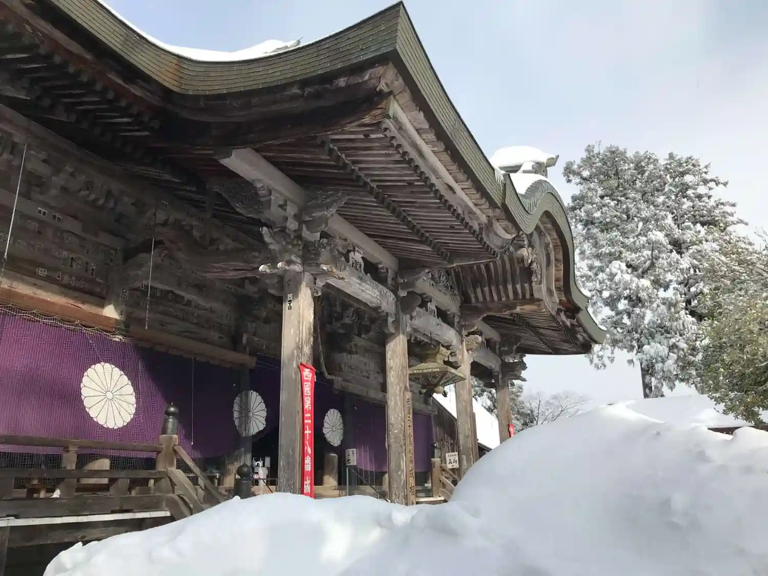 車で本堂に向かったが雪でタイヤがスタックし手前の急斜面が登れ…