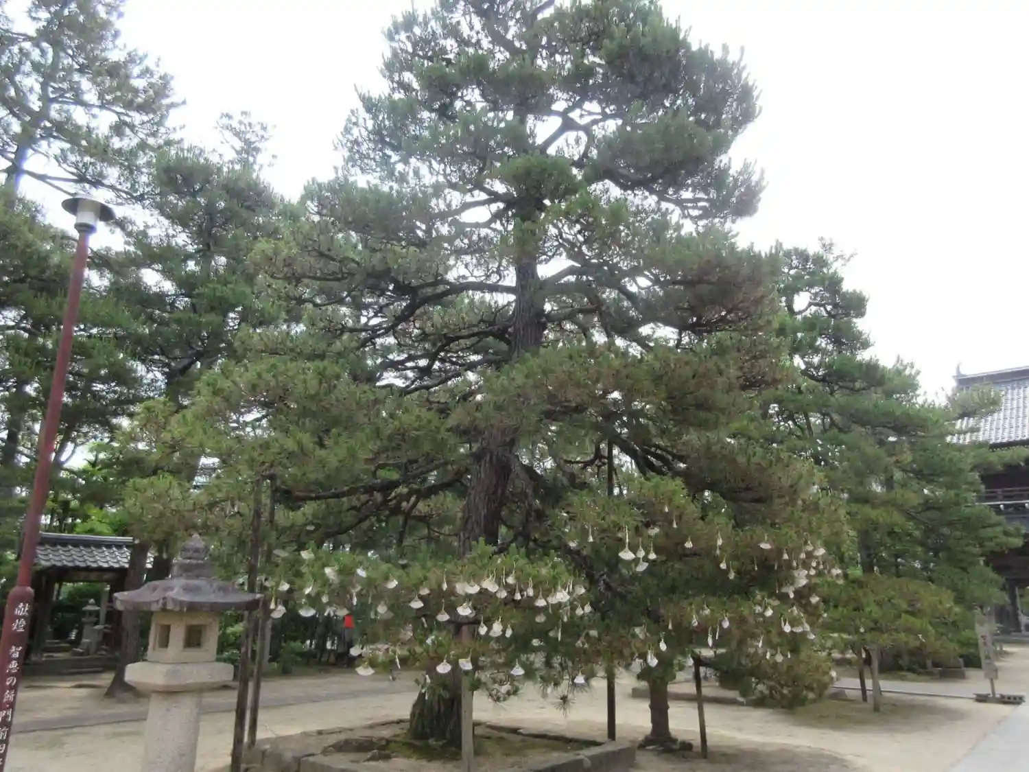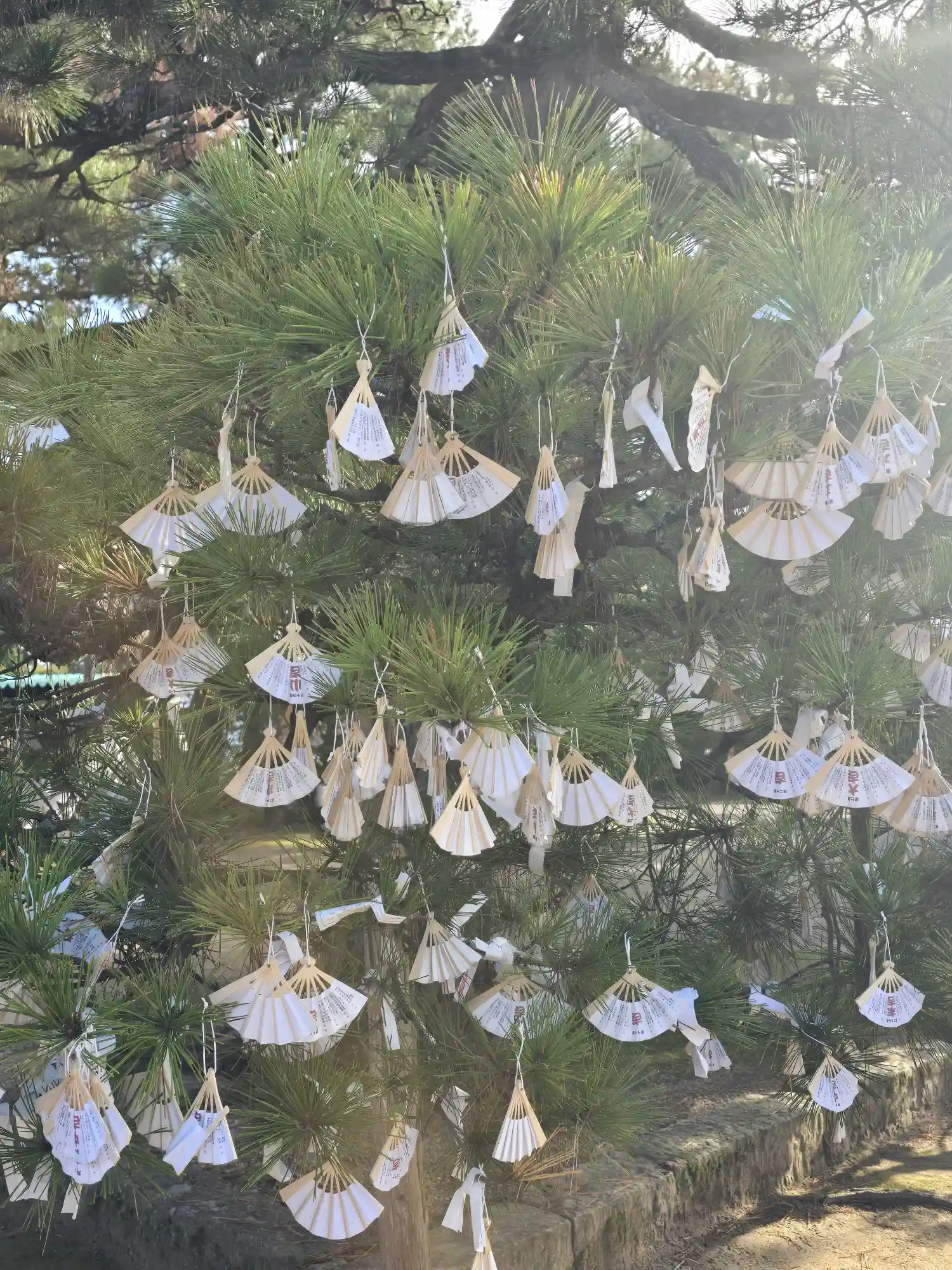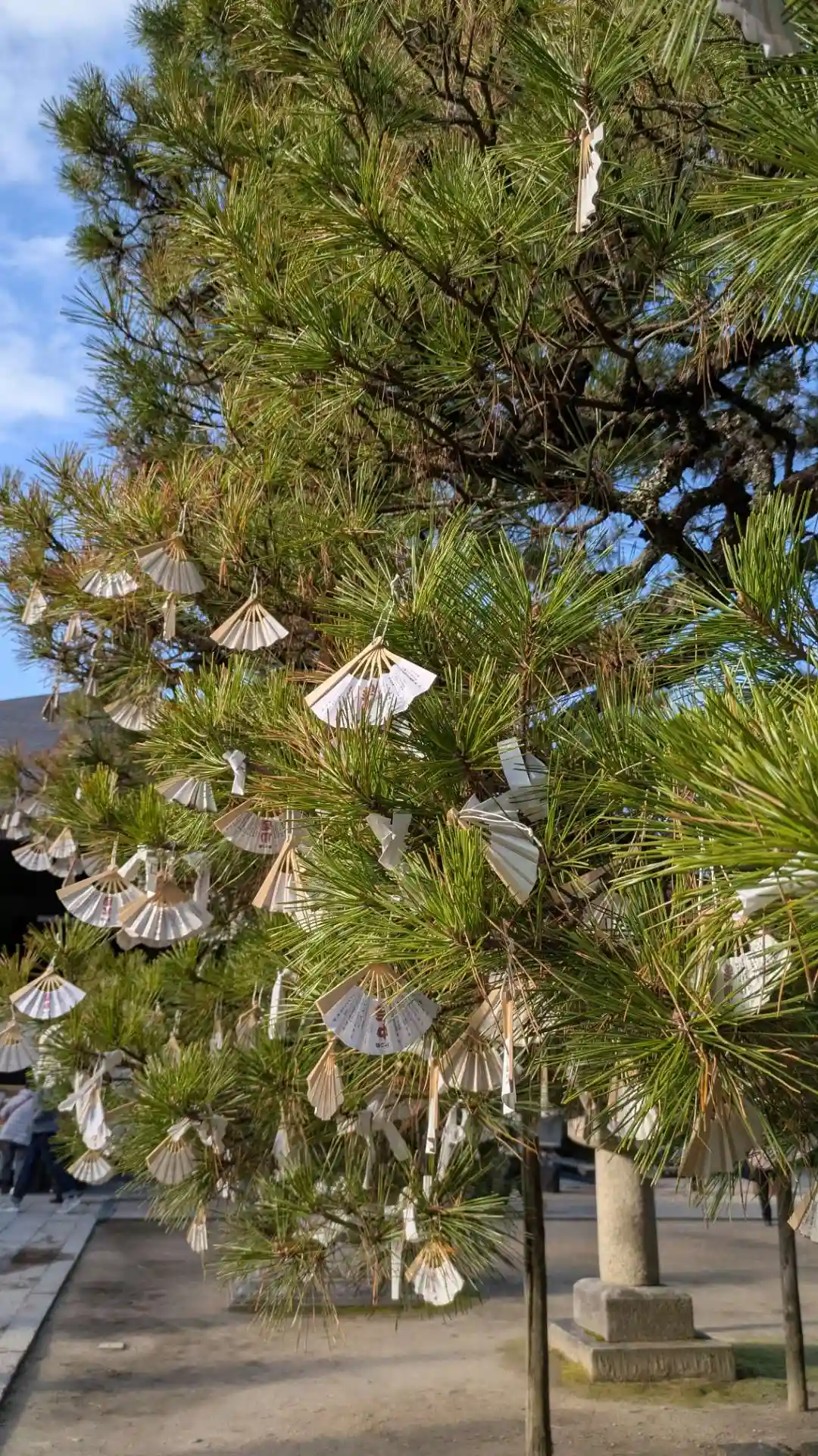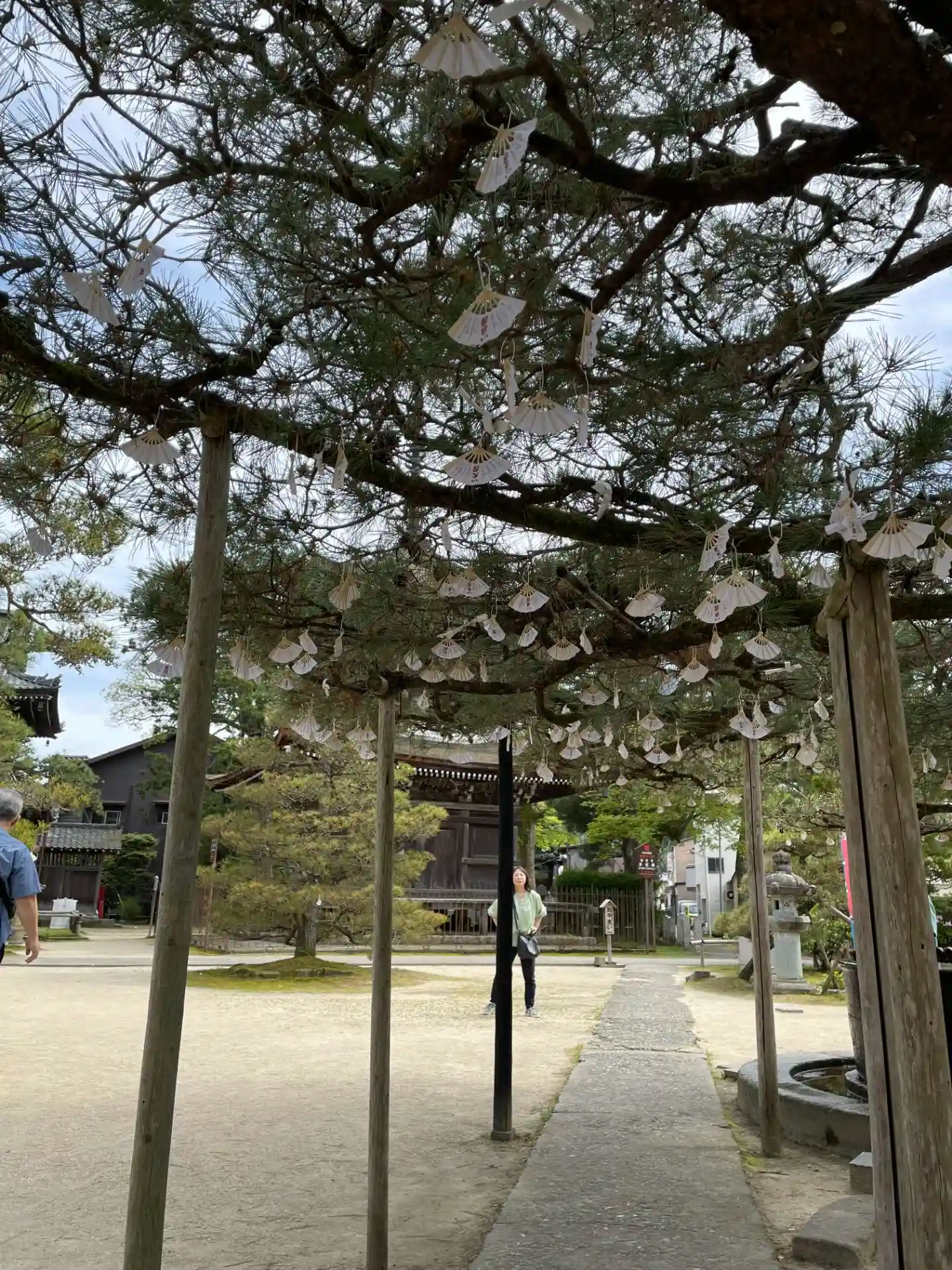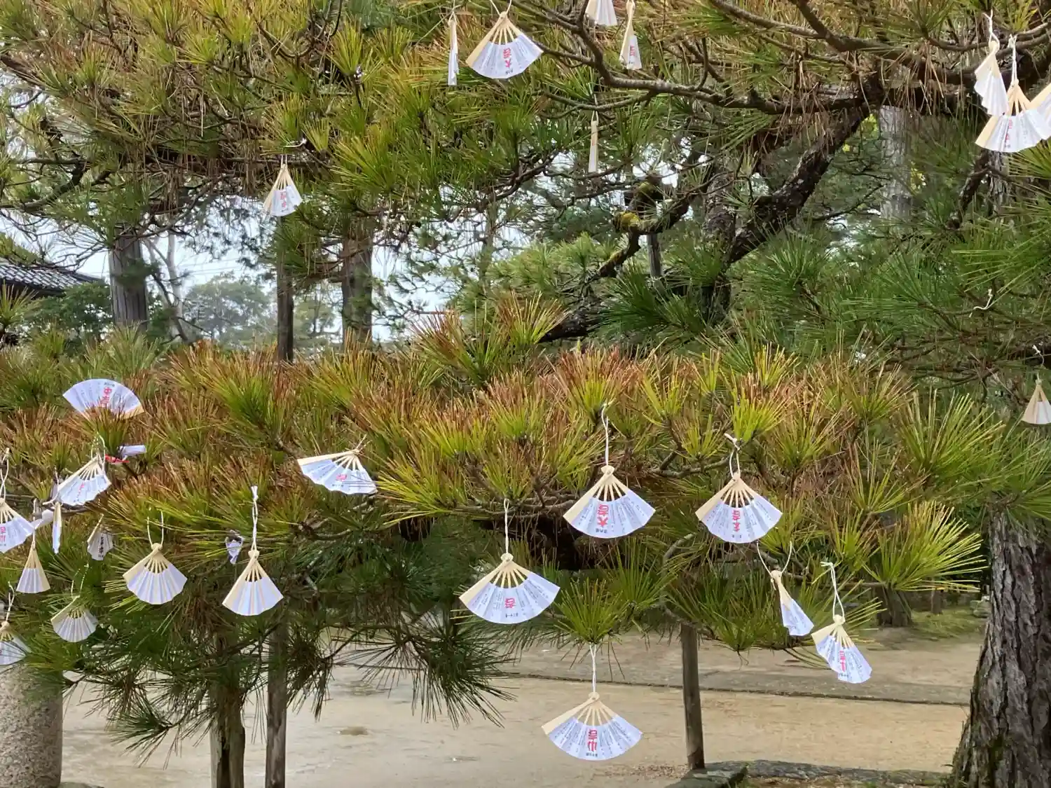境内の松の木には小さな扇子がたくさんぶら下がっています。
