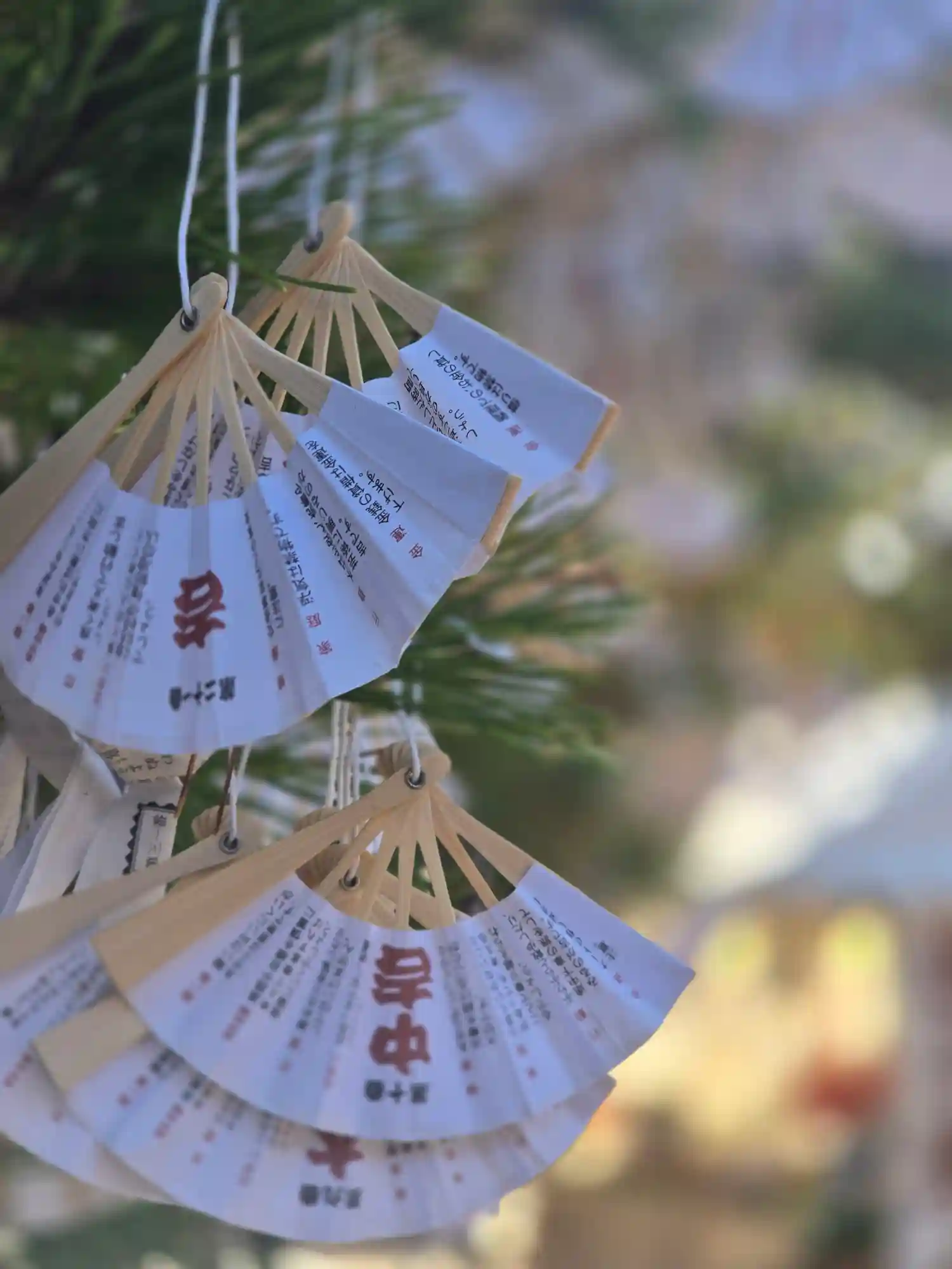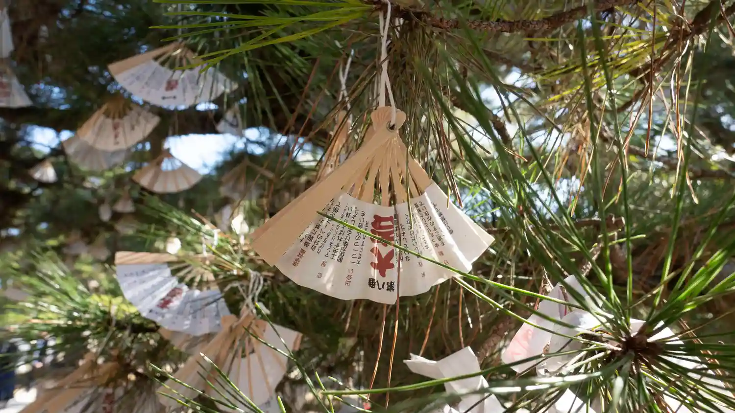 吉凶が書かれており、扇子おみくじを松の木に吊すのが