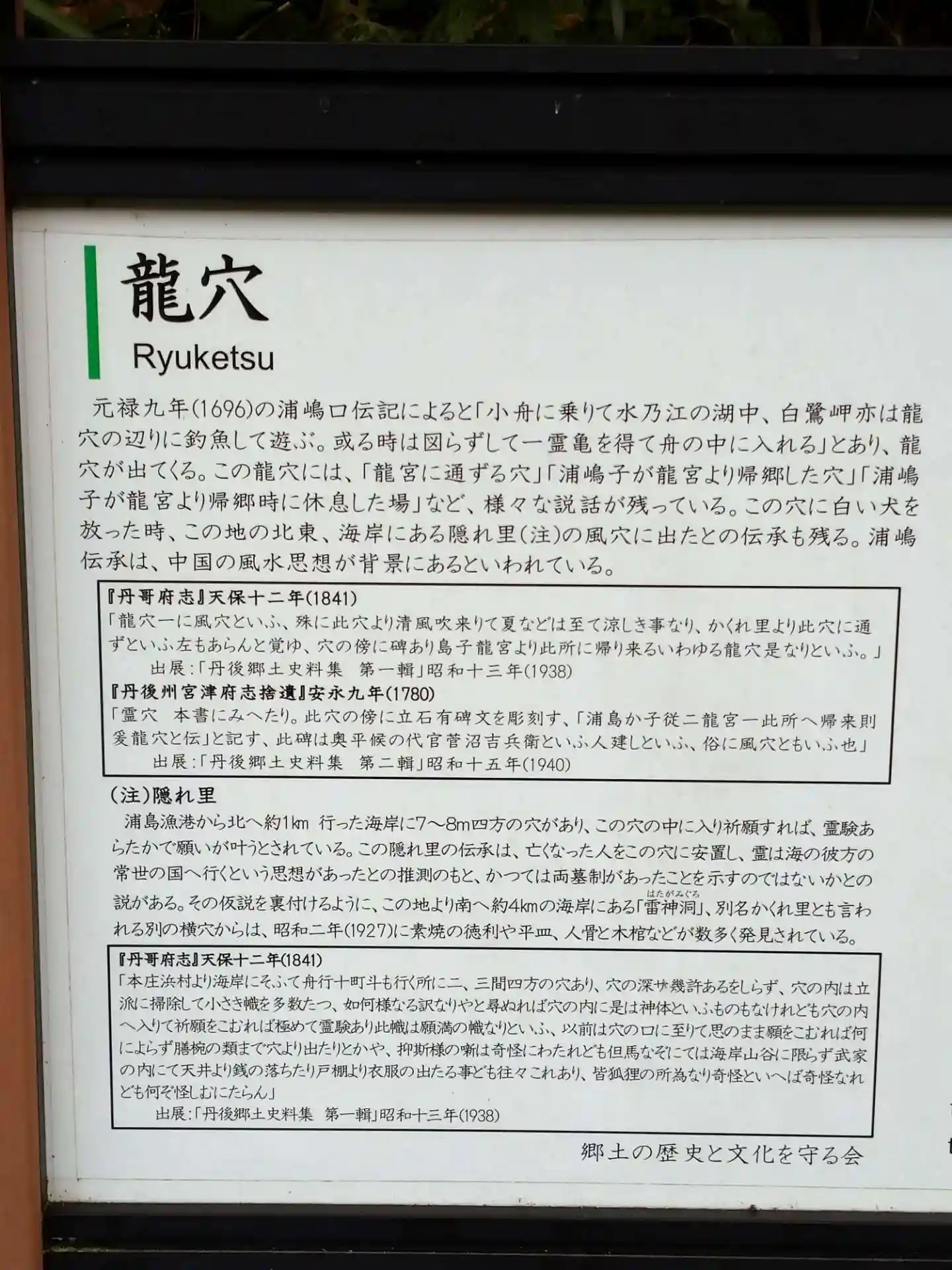 「霊穴 本書にみへたり。此穴の傍に立石有碑文を彫刻す、「浦島か子従二龍宮一此所へ帰来則爰龍穴と云」と記す。