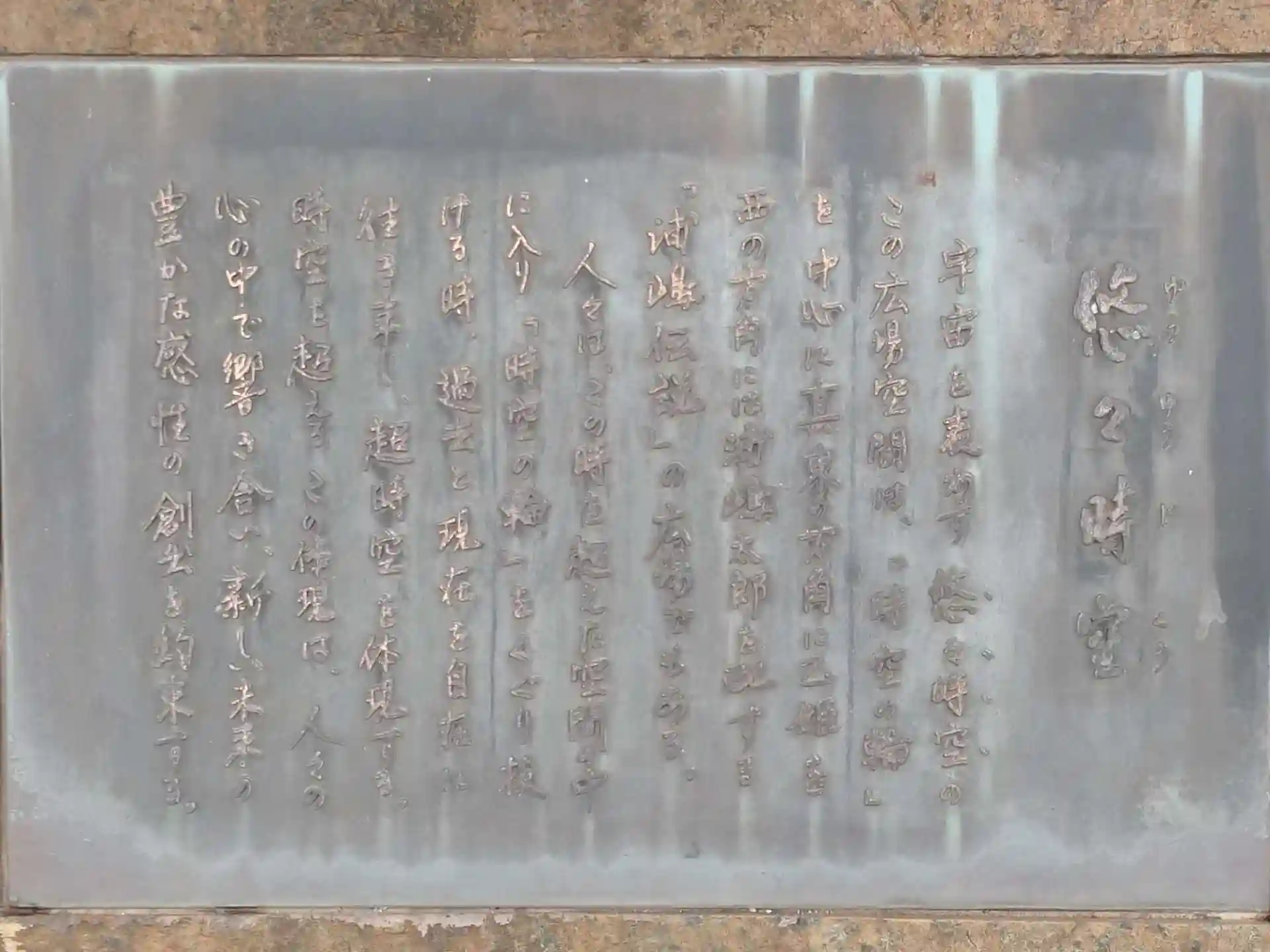 『悠々時空 宇宙を表す悠々時空のこの広場空間は、「時空の輪」を中心に真東の方向に乙姫を、西の方角に浦嶋太郎を配する「浦嶋伝説」の広場でもある。