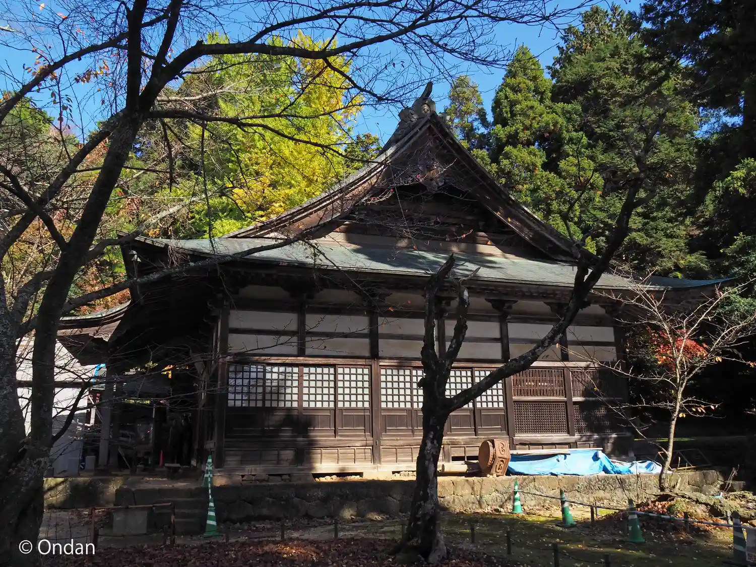 仁王門の先に石段。その奥が風情満載の本堂ですがシートに覆われています。復活までしばらく。