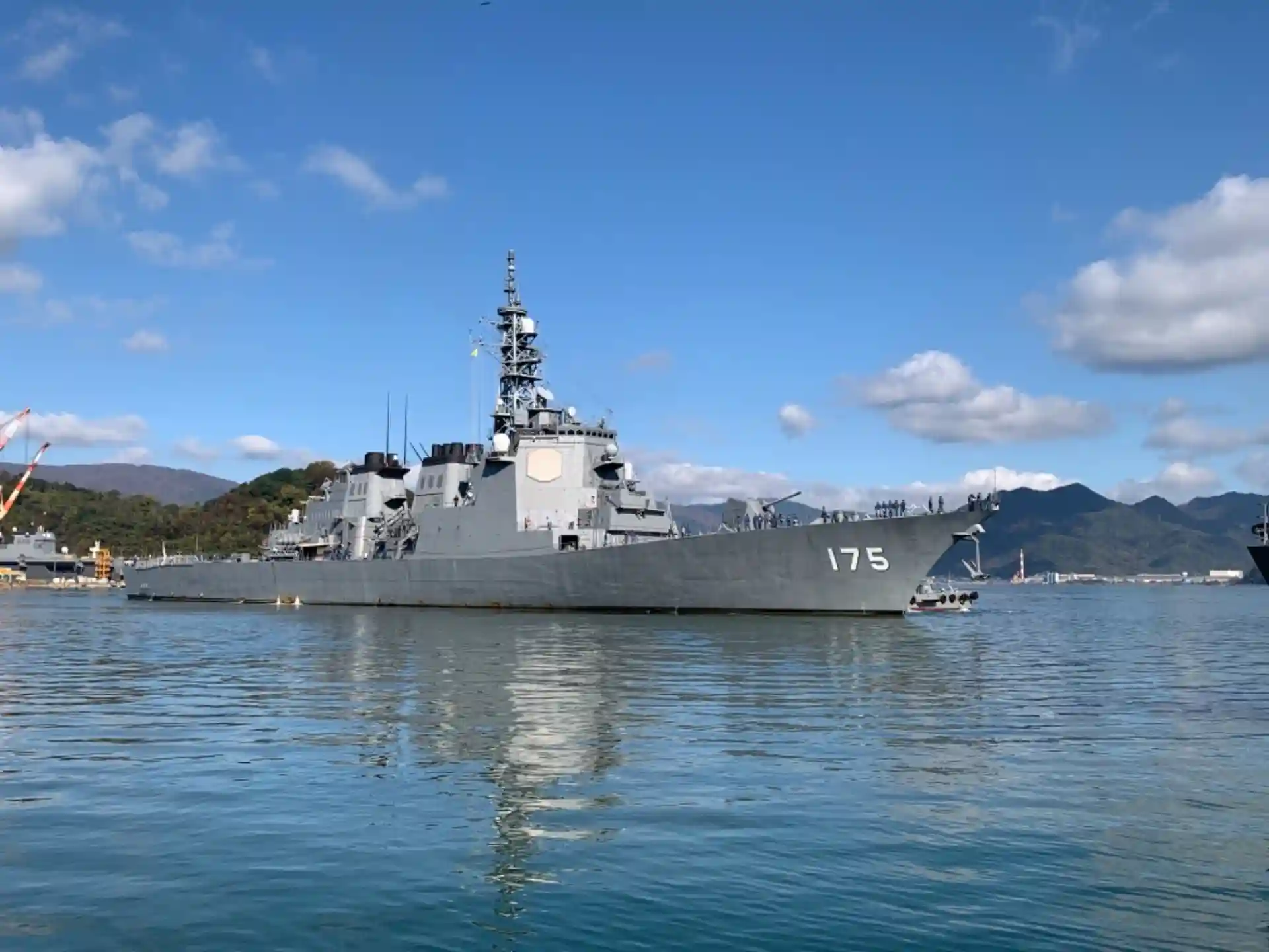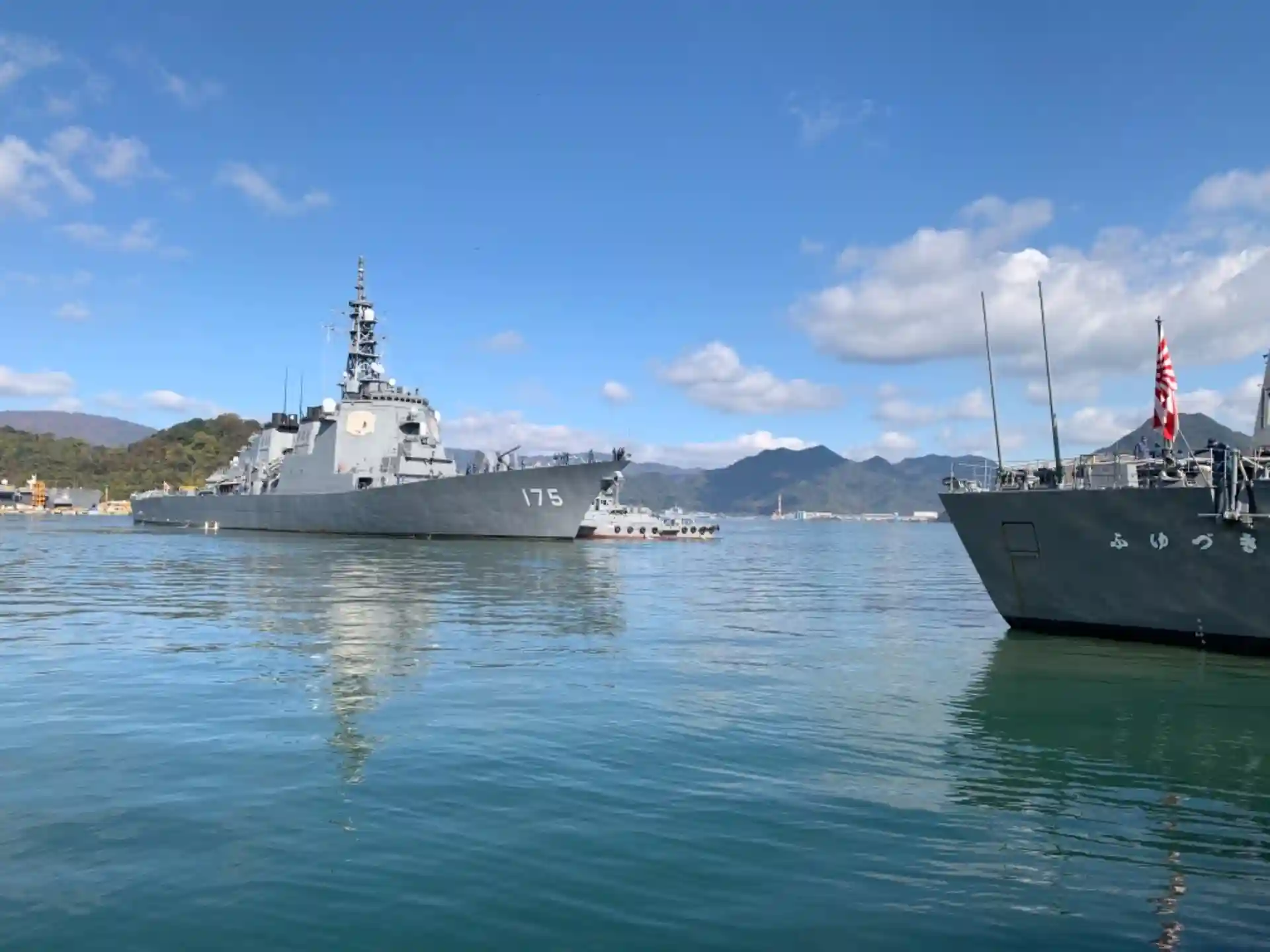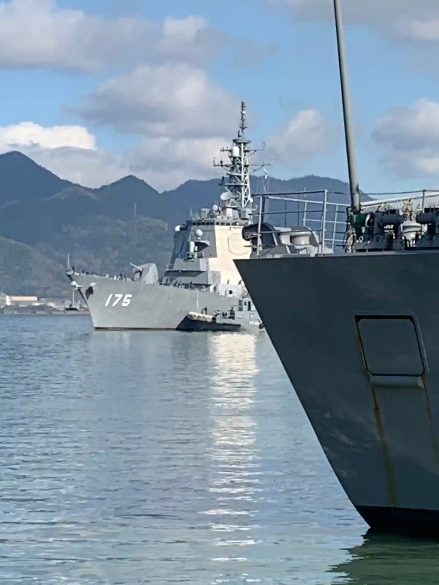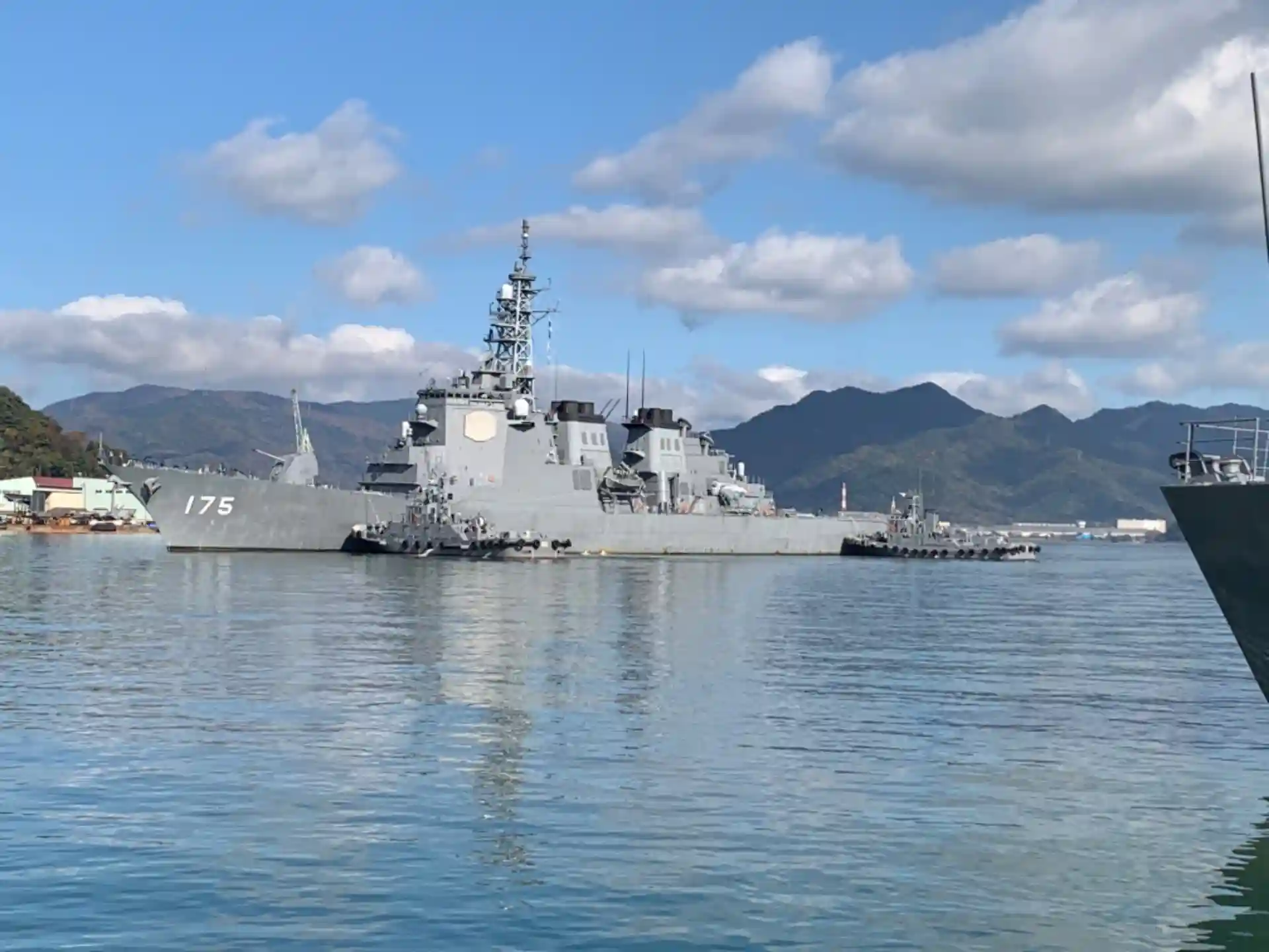 みょうこうが入港してきました。艦尾の一部が見えているのは、護衛艦ふゆづきです。ふゆづきも先程入港しばかりで、まだ接岸作業中です。