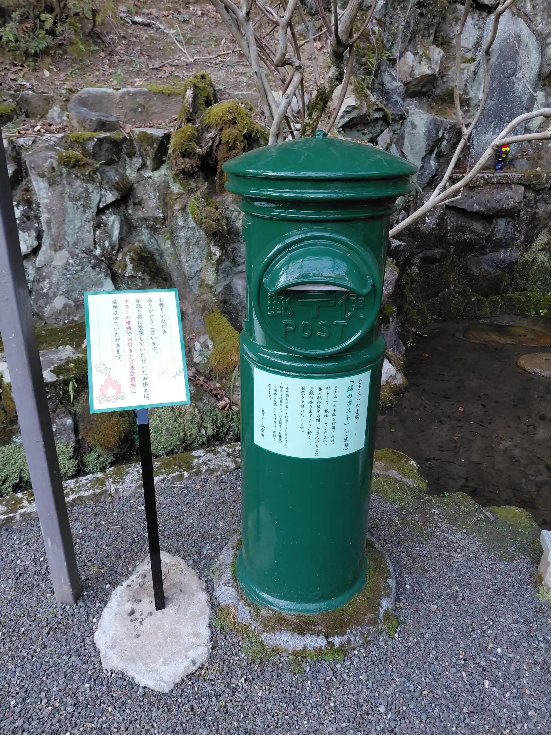 お参りしました。緑のポストがあります。亡き人への手紙を入れるポストです。本堂の掃除で忙しい中、住職さんに直書きの御朱印を頂きました🙇