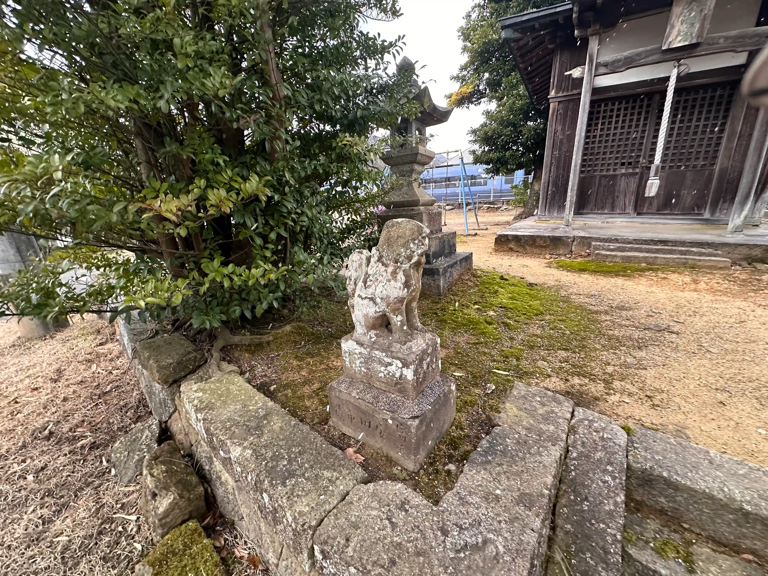 網野駅の線路側のすぐ前に鎮座されています。電車と同じアングルに、鳥居、狛犬、本殿が入るところなんて初めてでした。氏子さんが掃除をされていました。