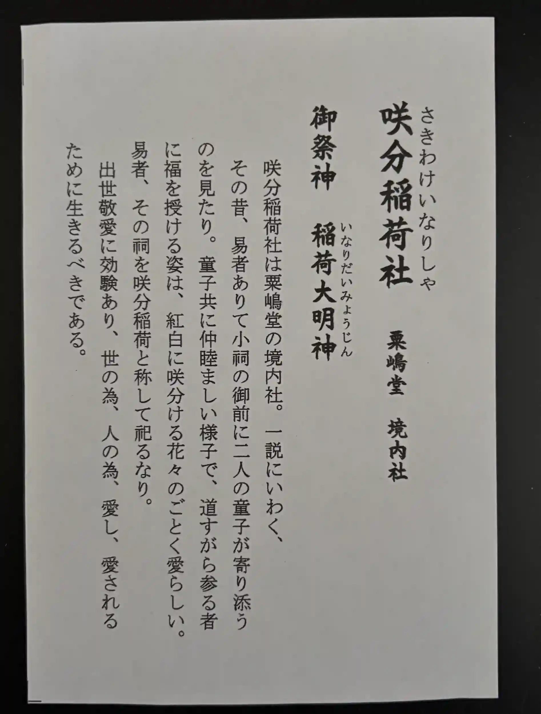 前回は粟島堂宗徳寺の御朱印を直書ていただきましたが、今回は境内社の咲分稲荷社の御朱印(書き置きのみ)を拝受。