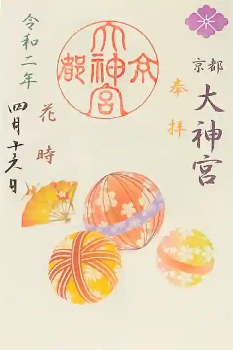 右上に紫色で花菱紋、その下に「京都大神宮」、オレンジ色で「奉拝」の文字、左に緑色で「令和二年」、茶色で「花時」の文字、左に日付が書かれています。真ん中に「京都大神宮」の丸印が押されています。桜の花の、ピンクやオレンジ色の可愛らしい手毬、折り鶴と金の扇の華やかなイラスト入りです。