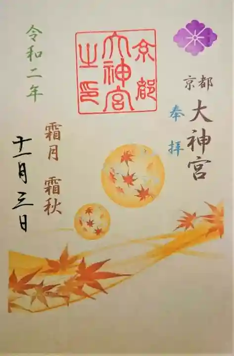 右上に紫色で花菱紋、その下に「京都大神宮」、青で「奉拝」の文字、左に緑で「令和二年」、茶色で「霜月 霜秋」の文字、その横に日付が書かれています。紅葉したモミジの流れのイラストに、真ん中に「京都大神宮之印」の角印が押されています。