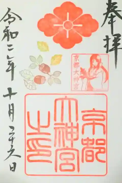 右上に「奉拝」の文字、左に日付が書かれています。真ん中に大きな「京都大神宮之印」の角印、花菱紋の印、巫女さんの上半身の印と、緑や黄色の葉とどんぐりの季節の印が押されています。