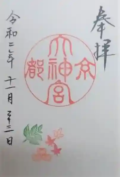 右上に「奉拝」の文字、左に日付が書かれています。真ん中に「京都大神宮」の丸印が押され、その下に柿や紅葉の季節の印が押されているシンプルな御朱印です。