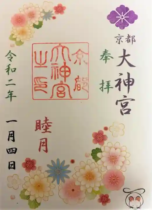 右上に紫色で花菱紋、その下に「京都大神宮」、緑色で「奉拝」の文字、左に緑色で「令和二年」、赤で「睦月」の文字、左に日付が書かれています。真ん中に「京都大神宮之印」の角印が押されています。全体に、金色の線で描かれたピンクや赤、水色の色とりどりの花が華やかです。右下にちょこんと干支のねずみがいます。