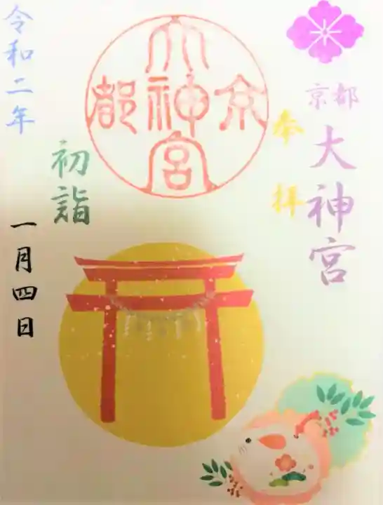 右上に紫色で花菱紋、その下に同じく紫色で「京都大神宮」、オレンジ色で「奉拝」の文字、左に水色で「令和二年」、緑色で「初詣」の文字、左に日付が書かれています。真ん中に「京都大神宮」の丸印が押されています。注連縄と赤い鳥居、干支のねずみの土鈴と南天、雪の模様が可愛らしくお正月らしいイラスト入りです。