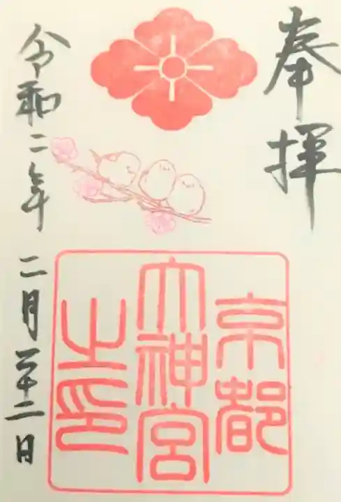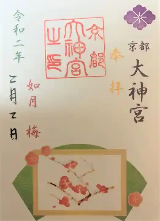 右上に紫色で花菱紋、その下に「京都大神宮」、オレンジ色で「奉拝」の文字、左に緑色で「令和二年」、ピンク色で「如月 梅」の文字、左に日付が書かれています。真ん中に「京都大神宮之印」の角印が押されています。紅梅のイラスト入りです。