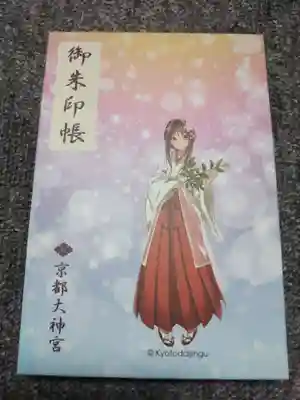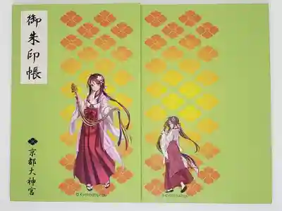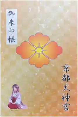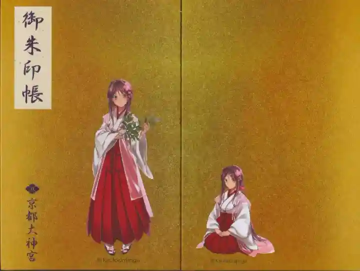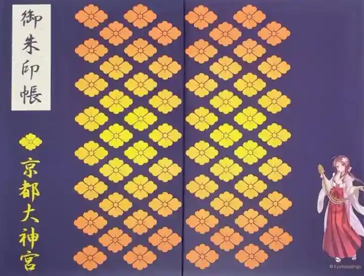 表紙に「御朱印帳」、花菱紋と「京都大神宮」の文字があり、全体が金色地です。表紙は京都大神宮のキャラクターである巫女さんの立ち姿、裏は座っているイラストです。同じデザインで2種類の大きさのものがあります。