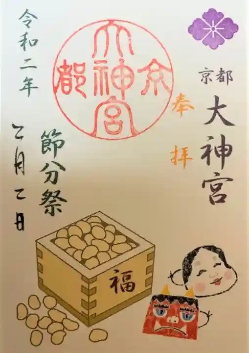 右上に紫色で花菱紋、その下に「京都大神宮」、オレンジ色で「奉拝」の文字、左に緑色で「令和二年」「節分祭」の文字、左に日付が書かれています。真ん中に「京都大神宮」の丸印が押されています。おかめと赤鬼のお面、升に入った福豆のイラスト入りです。