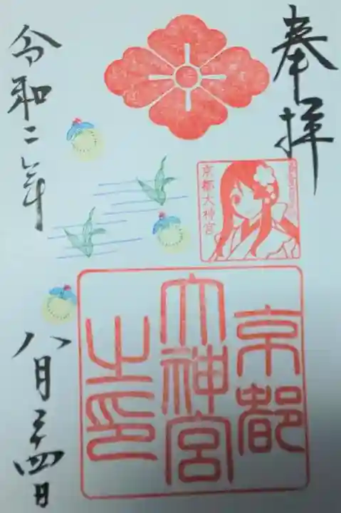 右上に「奉拝」の文字、左に日付が書かれています。真ん中に大きな「京都大神宮之印」の角印、花菱紋の印、巫女さんの上半身の印と、光る蛍が飛ぶ季節の印が押されています。