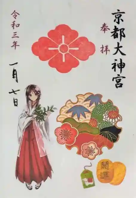 右に「京都大神宮」、赤で「奉拝」の文字、左側に赤で「令和三年」、その下に日付が書かれています。真ん中に大きく花菱紋が押され、立ち姿の巫女さんと、松竹梅の文様、開運と書かれた小判や、干支の牛の絵のお守りのイラスト入りです。