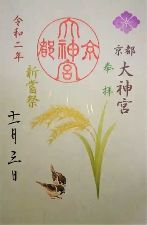 右上に紫色で花菱紋、その下に「京都大神宮」、緑で「奉拝」の文字、左に茶色で「令和二年」、黄色で「新嘗祭」の文字、左下に日付が書かれています。真ん中に「京都大神宮」の丸印が押され、黄金色の稲穂と雀のイラスト入りです。新嘗祭は、11月23日に行なわれる宮中の行事で、その年に収穫された新穀を神様にお供えして感謝の告げます。