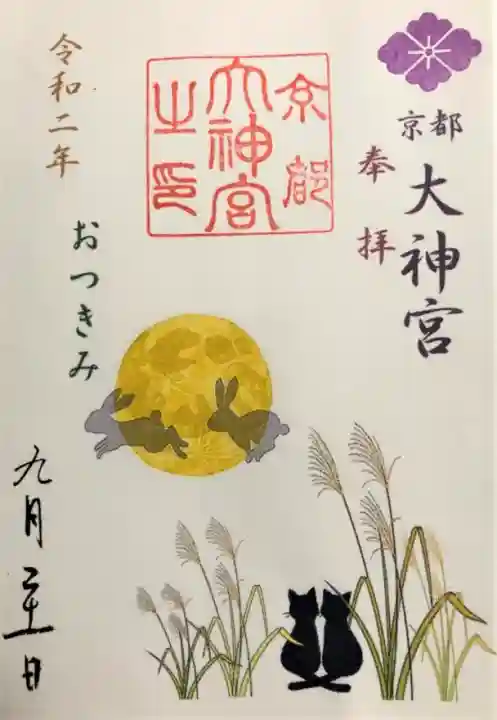 右上に紫色で花菱紋、その下に「京都大神宮」紫で「奉拝」の文字、左に茶色で「令和二年」、その下に「おつきみ」の文字、左下に日付が書かれています。真ん中に「京都大神宮之印」の角印が押され、月の上を跳ねるうさぎのシルエットと、ススキの中で寄り添って月を見ている2匹の猫のイラスト入りです。