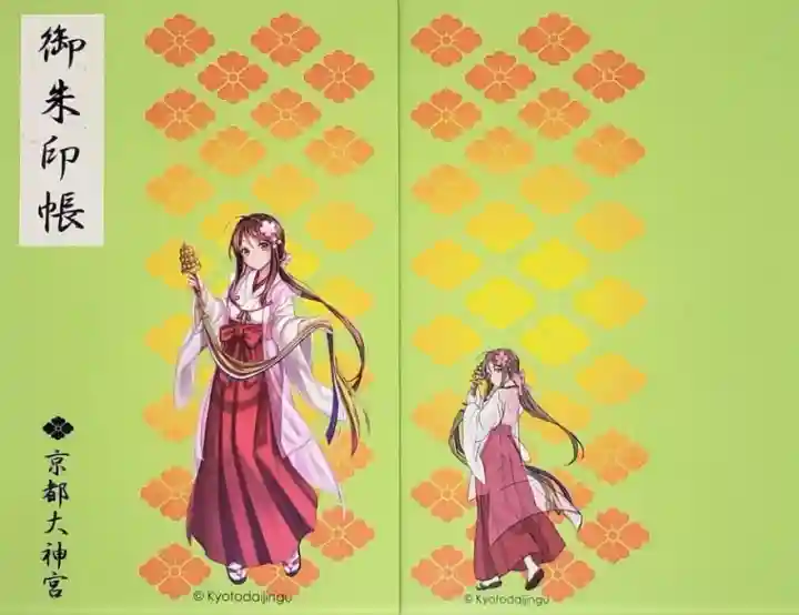黄緑色の地に、神紋である花菱紋がオレンジ色から黄色のグラデーションで並んでいます。表紙に「御朱印帳」、紺色で花菱紋と「京都大神宮」の文字があります。表紙に神楽鈴を手に舞う巫女さん、裏表紙には後ろ姿のイラストがあります。