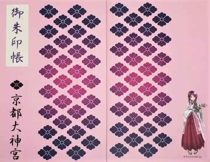 ピンク色の地に、神紋である花菱紋が紺色から紫色のグラデーションで並んでいます。表紙に「御朱印帳」、模様の色と同じ色で花菱紋と「京都大神宮」の文字があり、裏表紙に巫女さんの立ち姿のイラストがあります。