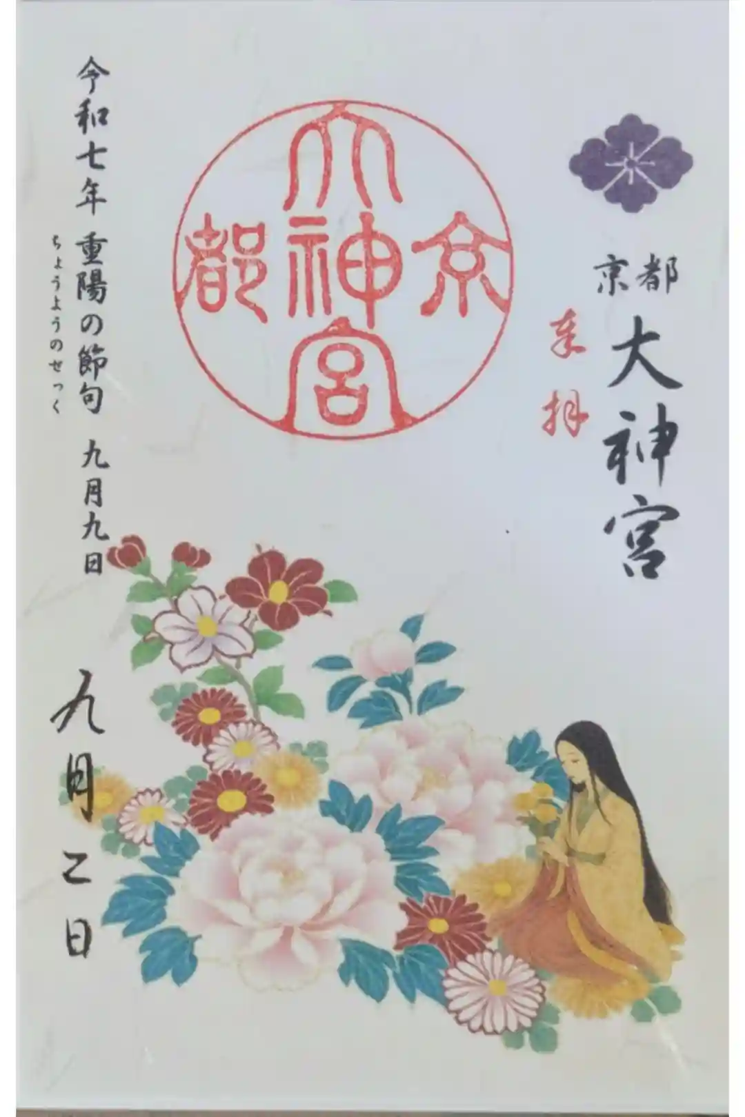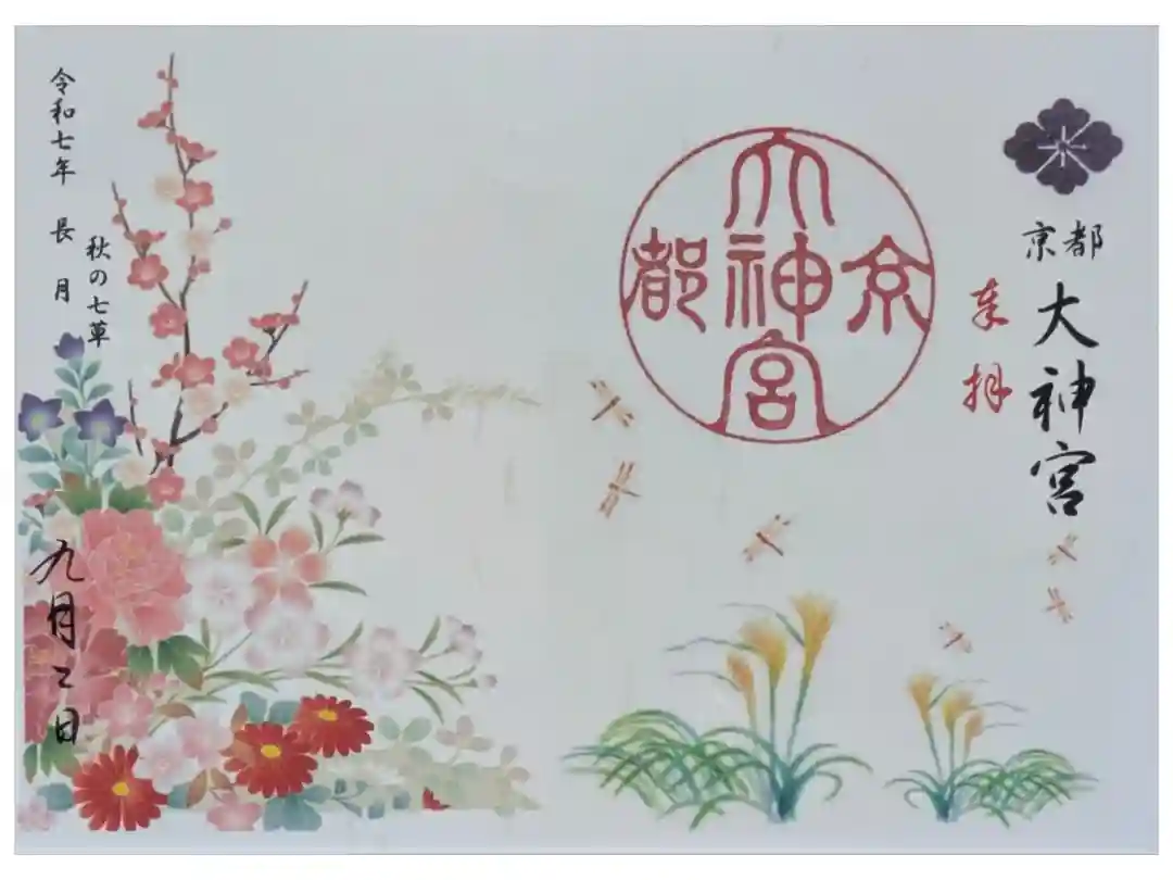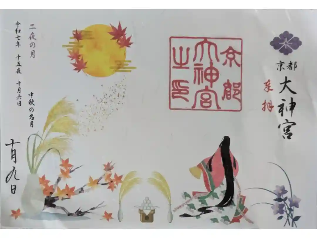 右上に「奉拝」の文字、左に日付が書かれています。「京都大神宮」の丸印が押され、その下に柿や紅葉の季節の印と、巫女さんのアップの印が押されています。