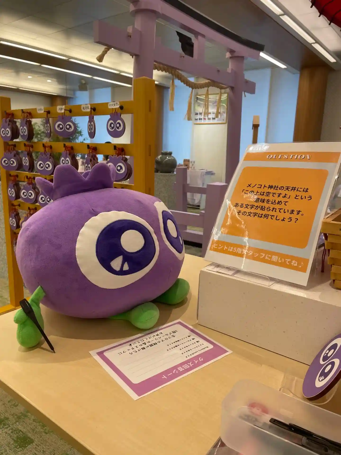 ちょっと番外シリーズ😊最近インスタなどで目にして気になっていた「わかさ生活」本社の「メノコト神社」へお詣りに🤗一階がカフェでブルーベリーのドリンクなどやマスコットキャラのブルブルくん・アイアイちゃんのグッズも販売しております。何やら撮影中だったのでどうしようかなぁと思って奥に進んでいくとエレベーターがあり、直接5階の神社へ行けるようです・・・が到着時はまだ開いておらず(10時過ぎ)😱11時からとのことなので時間潰してから再来社。無事お参りすることが出来ました🤗紫の鳥居に日本で唯一の狛ベリー(当たり前か🤣)創建は昨年(令和6年)の12月とまだ半年ぐらいなのでこれからいろいろ行事とかされるのかな?八坂神社さんのサポートのためかお守りやおみくじ、絵馬も本格的です。祇園祭限定御朱印もされていたので今後に期待ですね🤗