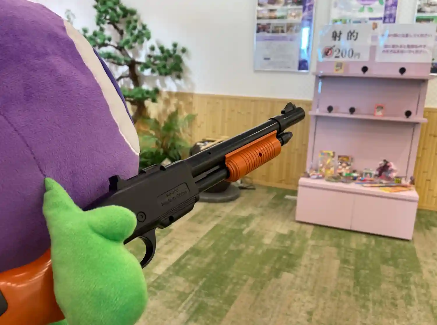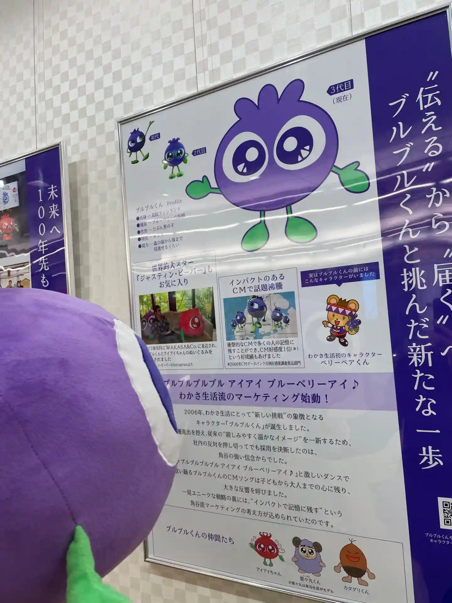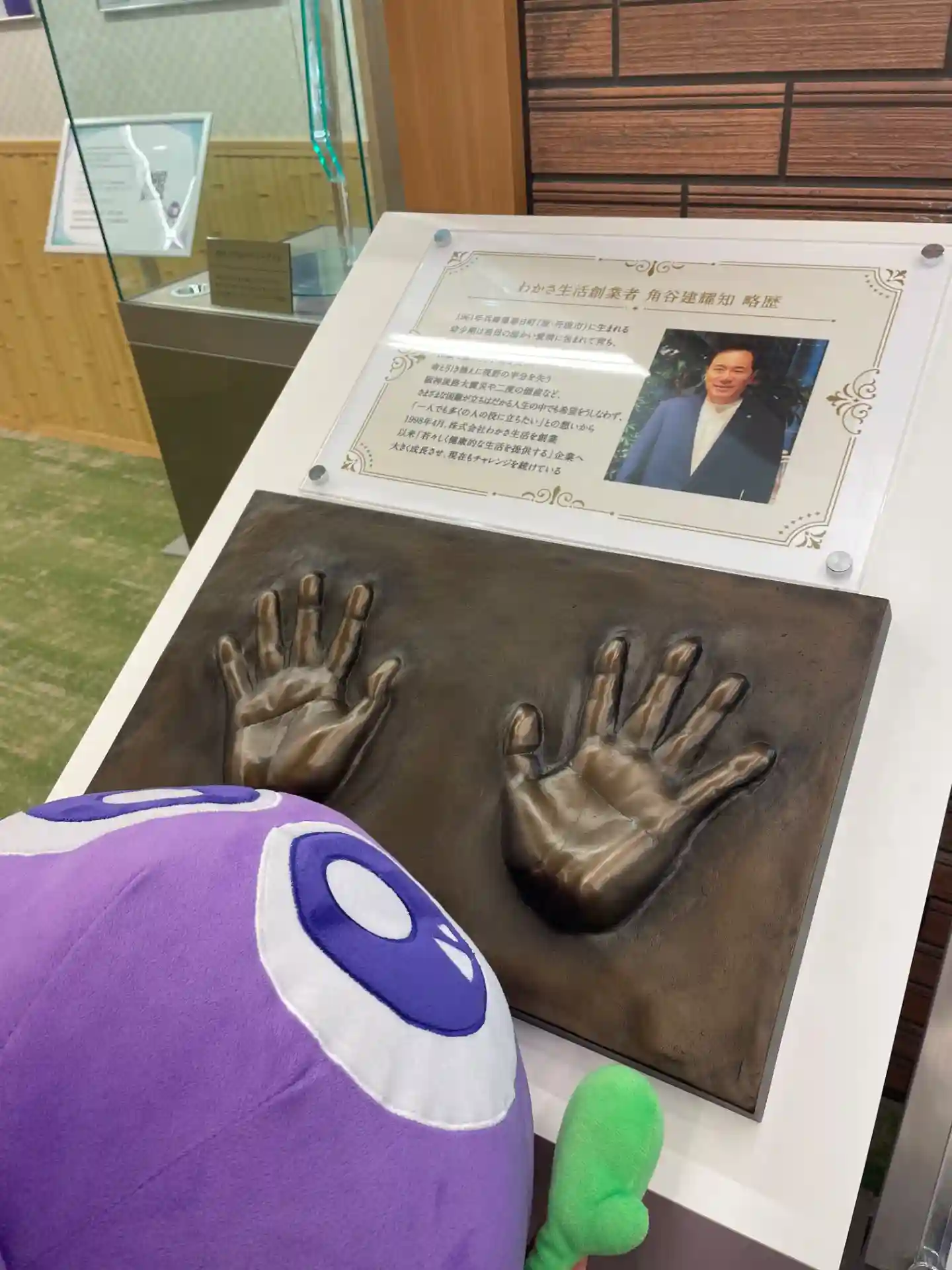 スタッフのクマサキさん🐻に連れられ、角谷社長の手形を覗き込むブルブルくん。社長には天下取りの相と言…