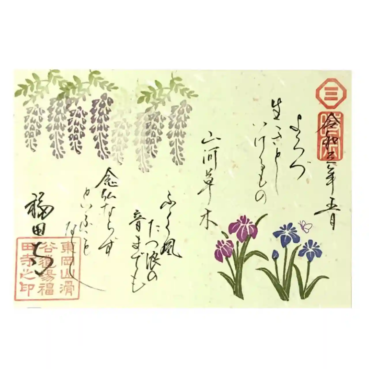 藤、菖蒲に宗祖一遍上人のお言葉より「よろづ生きとしいけるもの、山河草木、ふく風たつ浪の音までも念仏ならずといふことなし」