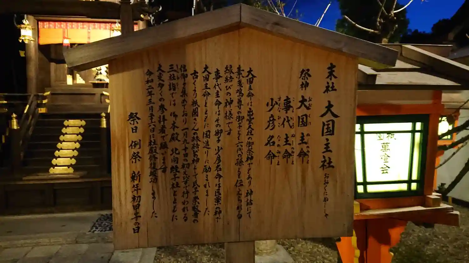 夜だったことと、お祭り?だったのか出店が多く参拝客がたくさんいて静かに回れなかったのとで、裏手の美…