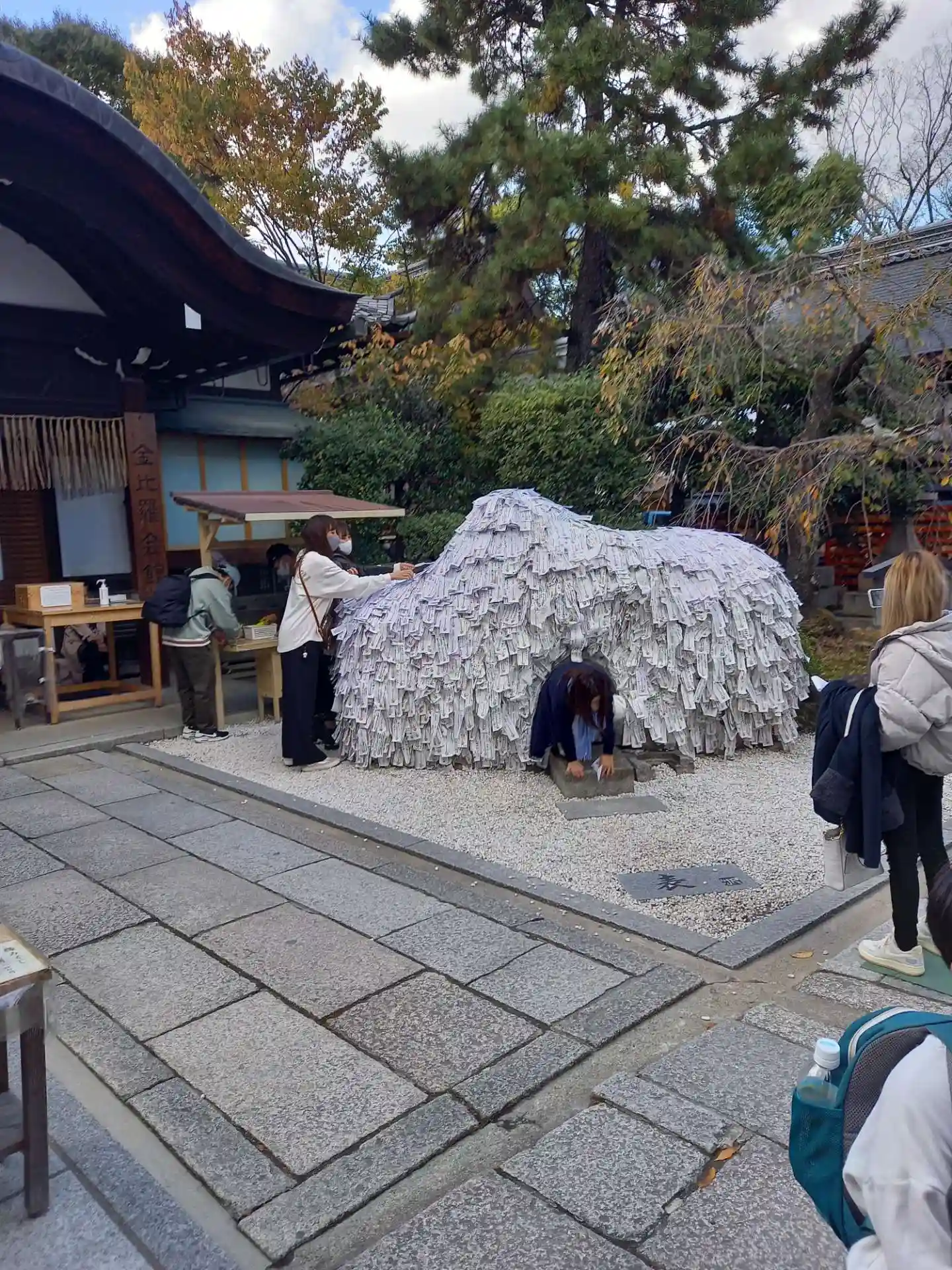 安井金比羅宮にお参りに来ました。多くの人がお参りに来ていました。 縁切り縁結び碑に御札を付けるため…